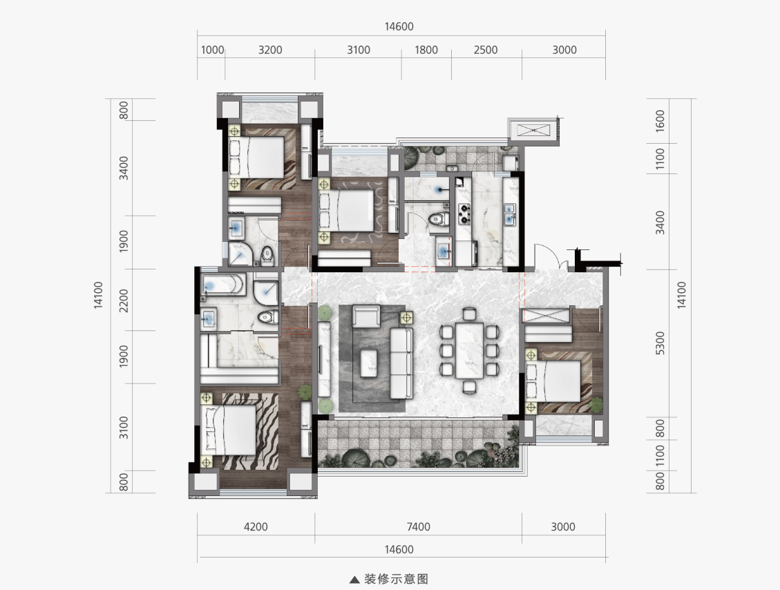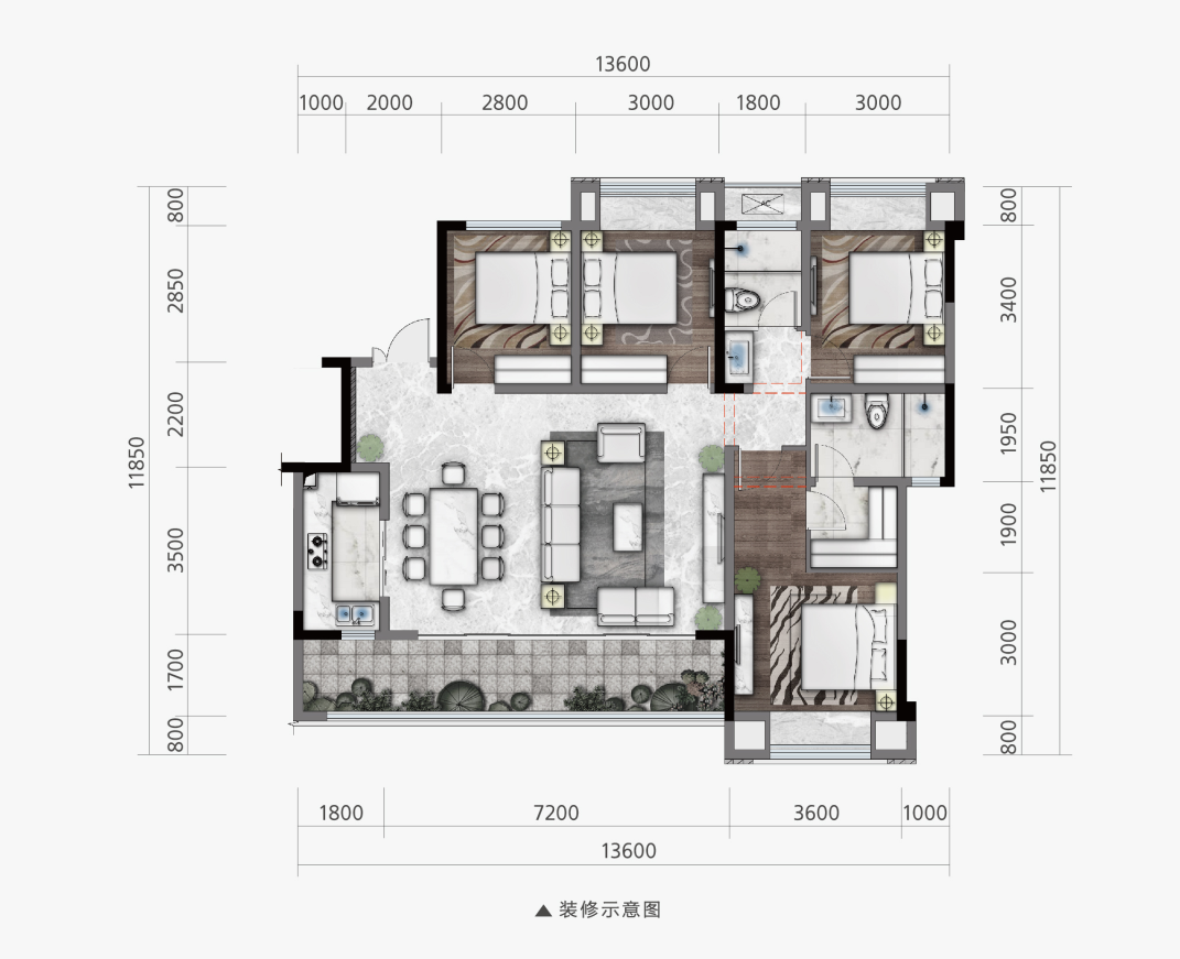C户型(建面约161㎡,套内约136㎡)四室两厅三卫