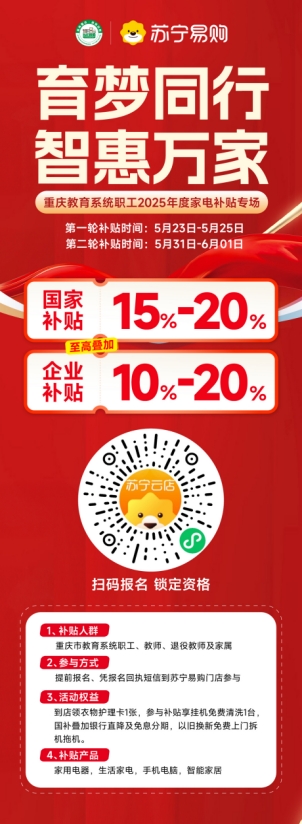 根据《关于2025年加力扩围实施大规模设备更新和消费品以旧换新政策的通知》(发改环资〔2025〕13号)及《重庆市推动大规模设备更新和消费品以旧换新行动方案》文件精神,苏宁易购集团将于5月24日—25日、5月31日—6月1日对全市教育系统干部职工开展“育梦同行智惠万家”家电专场补贴活动,并同步开展空调免费清洗、家电补贴服务行活动。各单位教职员工可自愿报名参加。