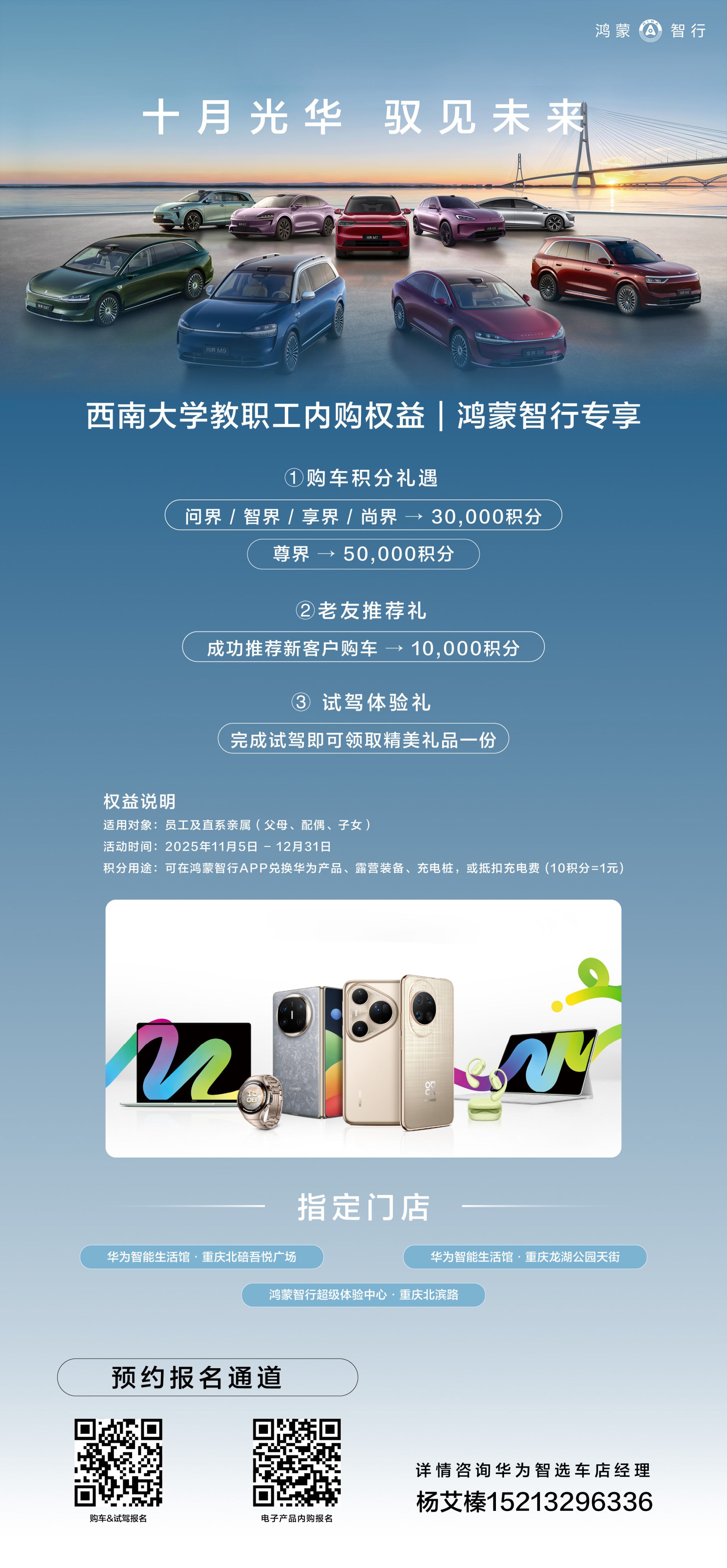 即日起至12月31日,为回馈各位师者一年的辛勤耕耘,华为公司为西大教职工带来专属权益。作为全球领先的科技企业,华为始终致力于将前沿科技与人文关怀带给每一位消费者。华为公司本次福利涵盖鸿蒙智行汽车及华为3C产品,旨在为各位教职工带来切实利好。详细活动方案如下,可自行扫码报名。