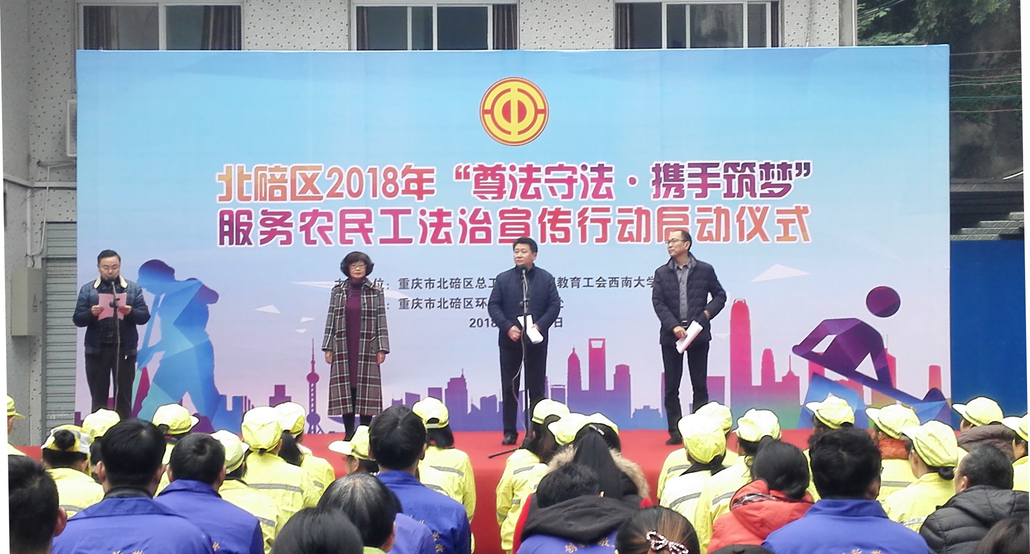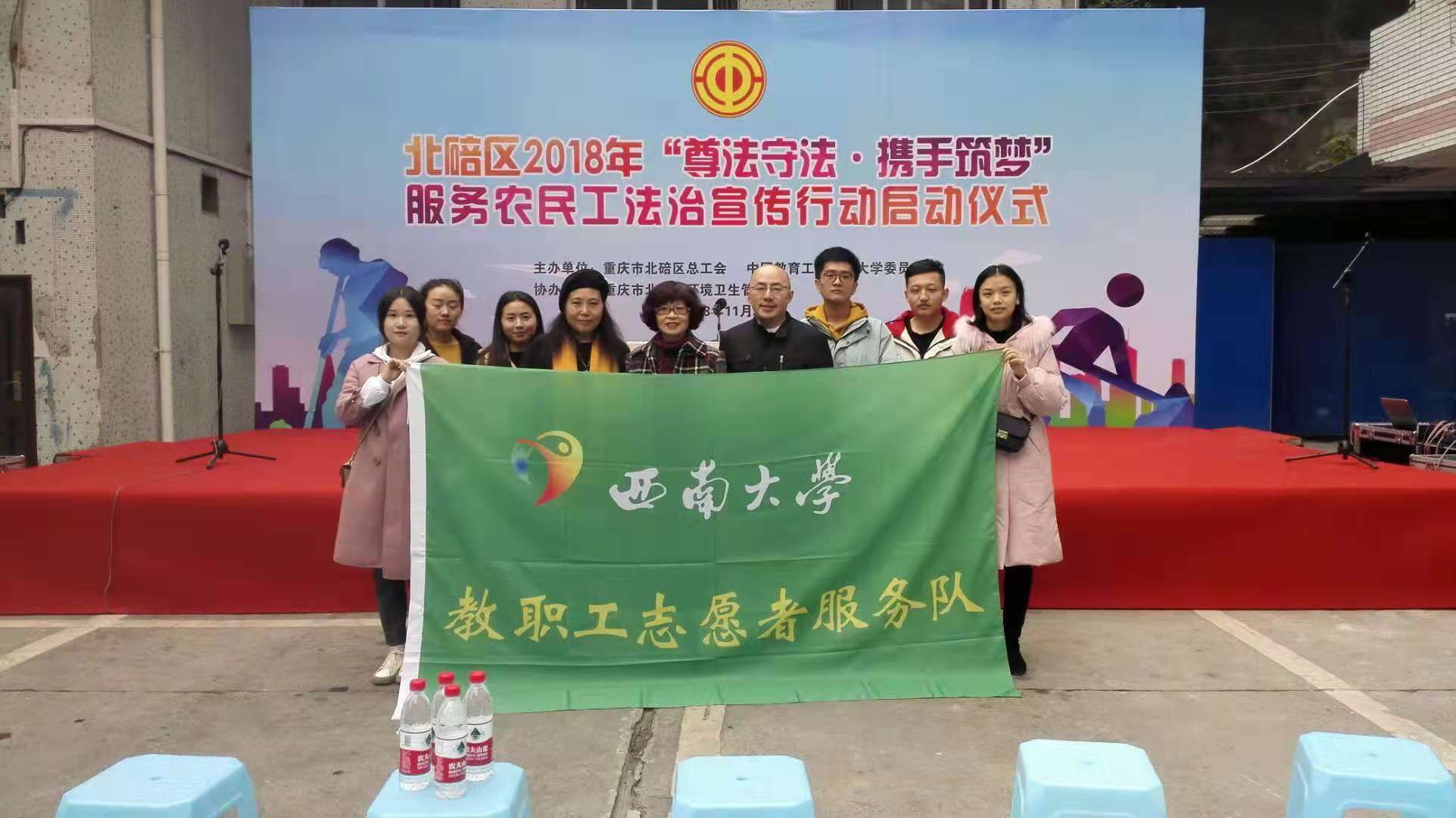 为进一步做好新形势下农民工工作,加强对农民工的人文关怀、法治宣传教育和服务工作,进一步提高农民工法治意识,引导他们依法依规理性表达利益诉求,自觉维护社会和谐稳定;拓展工会、政府、高校资源共享,渠道共建,联动服务社会;鼓励高校师生参与服务农民工实践,增强服务社会、奉献国家的意识,提高社会实践能力和水平。按照重庆市教科文卫体工会的总体部署,PA视讯集团教职工志愿者服务队在校工会副主席胡席玉带领下于2018年11月29日在北碚区环卫处开展了“尊法守法·携手筑梦”服务农民工法治宣传行动。