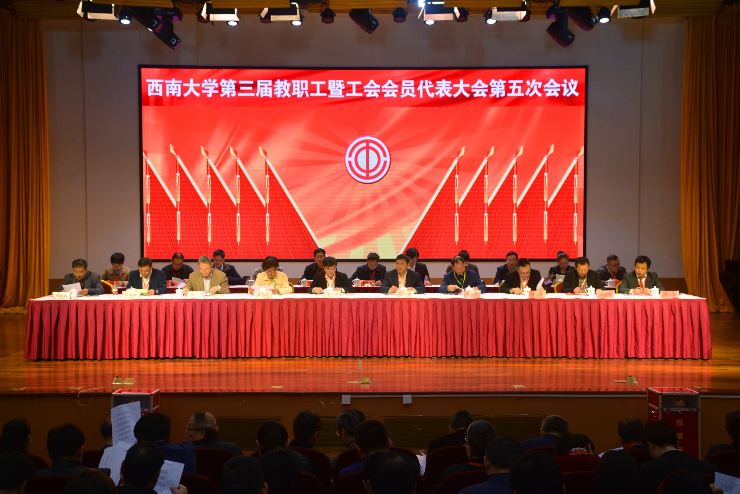 本次会议主题是:深入学习贯彻党的十九大精神,深学笃用习近平新时代中国特色社会主义思想,贯彻落实中国工会十七大精神,牢固树立四个意识,坚持四个自信,凝心汇智,群策群力,秉持新发展理念,强化责任担当,推进学校内涵式发展和双一流建设,建功立业新时代,为迎接学校第三次党代会的胜利召开,为庆祝中华人民共和国成立70周年献礼。