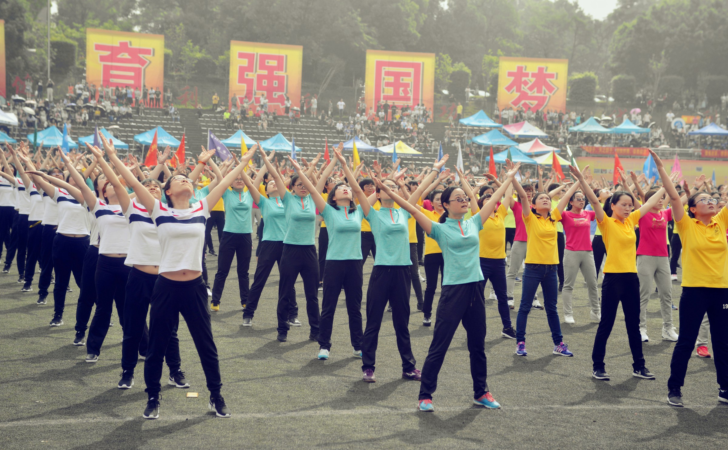 广播体操比赛更是教职工风采的集中展示,宏大的比赛场面给人留下深刻的印象,运动员们整齐标准的动作、飒爽的英姿,挥舞出我校教职工激扬的旋律,赢得了现场观众的阵阵掌声和喝彩声。最终机关工会、企业工会、后勤集团获得一等奖;校医院、政治与公共管理学院、药学院中医药学院、经济管理学院、文化与社会发展学院获得二等奖;图书馆、地理科学学院、生物技术学院、材料与能源学部、心理学部、外国语学院、园艺园林学院学院获得三等奖。