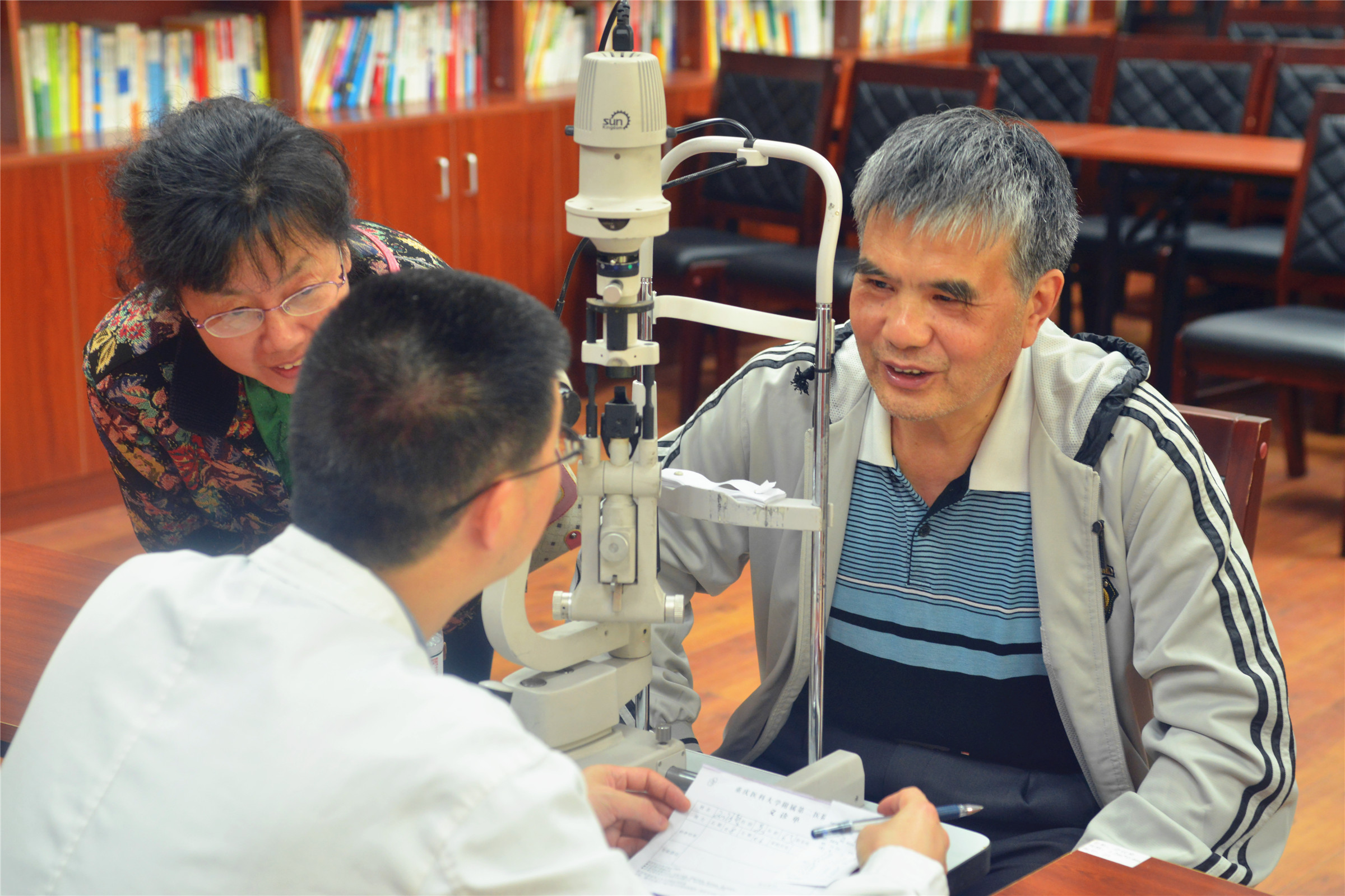 义诊检查的内容主要包括视力测试、眼底疾病、白内障及青光眼的筛查等。医院工作人员为疑似眼科疾病的教职工进行了系统的视力测试和眼病筛查,并为前来检查的患者做了详细的记录,便于日后跟踪随访。对于部分教职工的特殊症状需要进一步检查的,医生指导教职工到医院做进一步的诊断检查。