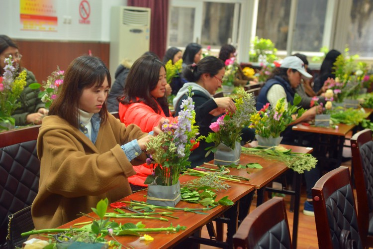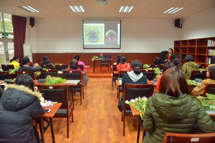 3月6日下午,在圆顶多功能厅弥漫着鲜花的芬芳,一场插花技巧讲座在女教职工热烈的掌声中开始。通过插花老师生动形象的现场制作讲授,大家很快认识了各种花材和插花器具,了解了插花制作的基本技巧、造型和插花艺术的美学鉴赏等基本知识。女教职工们精心构思,认真修剪,制作出了一件件春意盎然、清雅别致的插花作品,为这个春天妆点了靓丽的景色。