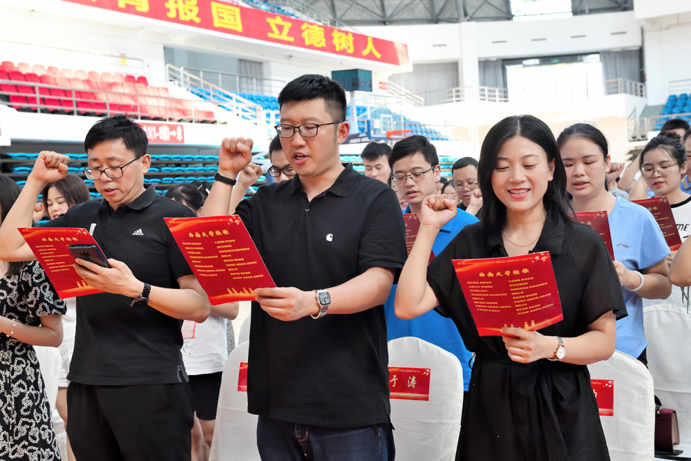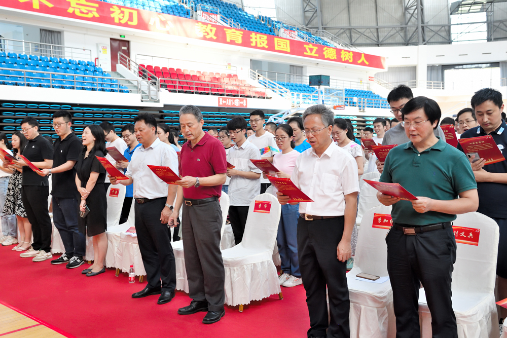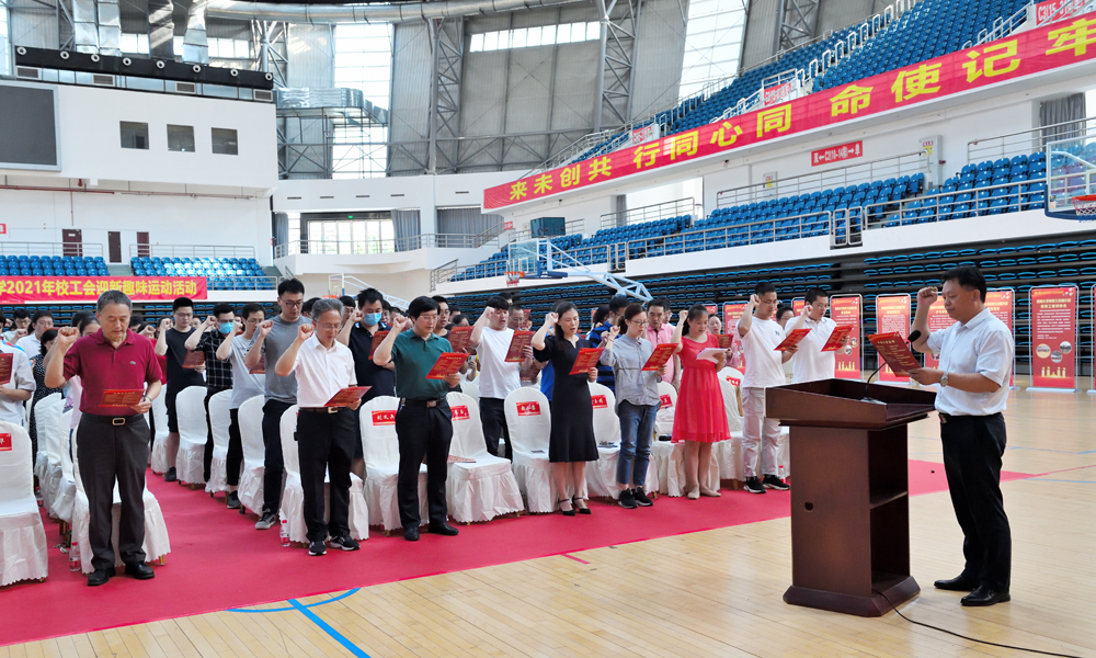 活动中,新闻传媒学院杨绍婷老师代表新进教师发言。赵子华主席领导新会员集体宣读入会誓词,现场领导和嘉宾为新会员代表颁发了入会纪念品。最后全体人员起立合唱PA视讯集团校歌。振奋人心的合唱,响亮的歌声在中心体育馆上空回荡,点燃了大家心中火一般的爱校激情。