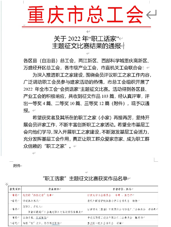 喜报!学校图书馆工会荣获重庆市“职工话家”主题征文比赛一等奖
