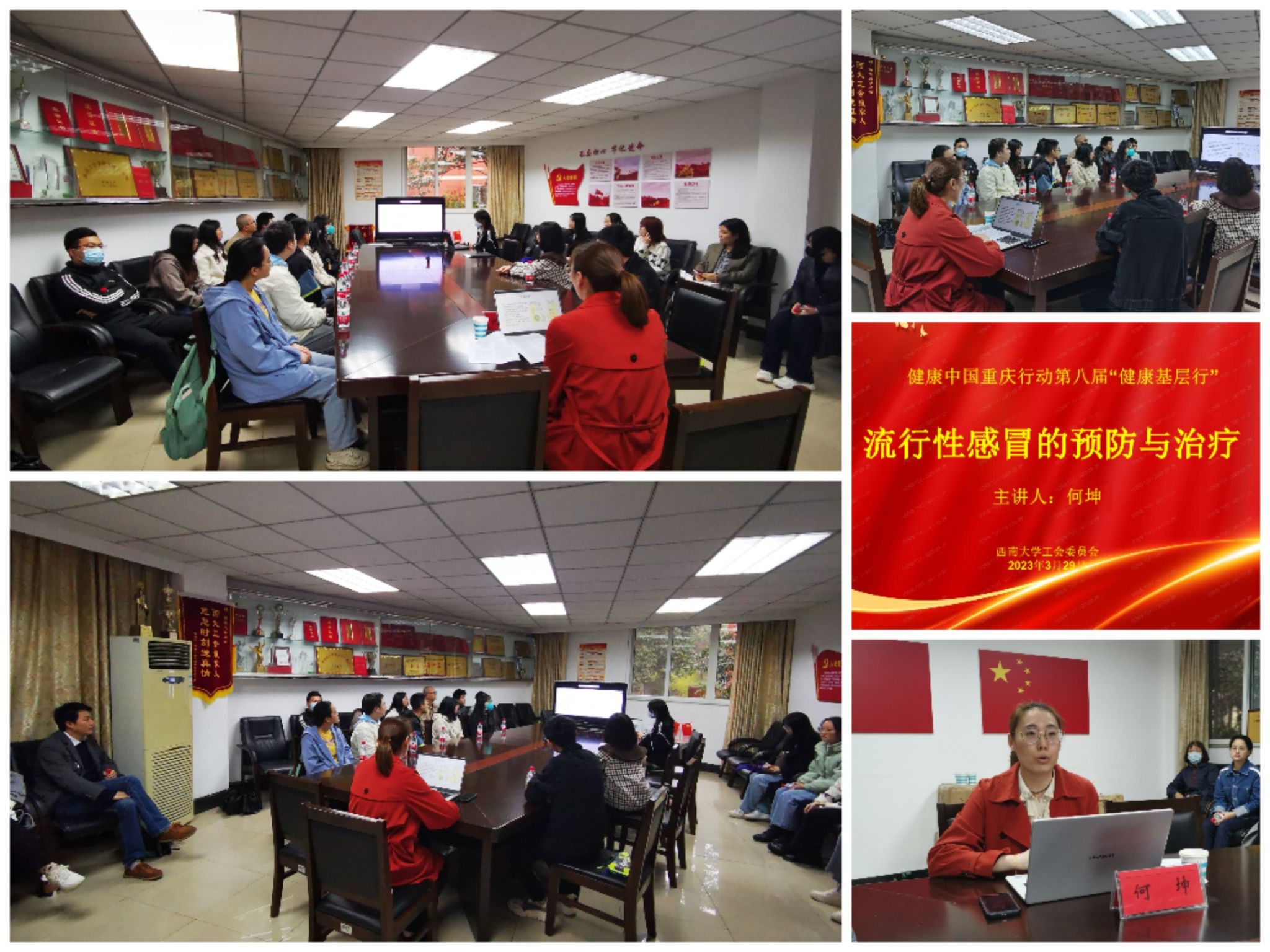 当前正值流感高发季节,为增强师生对季节性流感的了解和预防,促进健康,结合当前学校疫情防控和工会工作实际,2023年3月29日,校工会在208会议室举办流行性感冒相关知识专题健康讲座,为师生办实事,积极响应“健康中国重庆行动”重庆市教科文卫体工会第八届“健康基层行”活动。