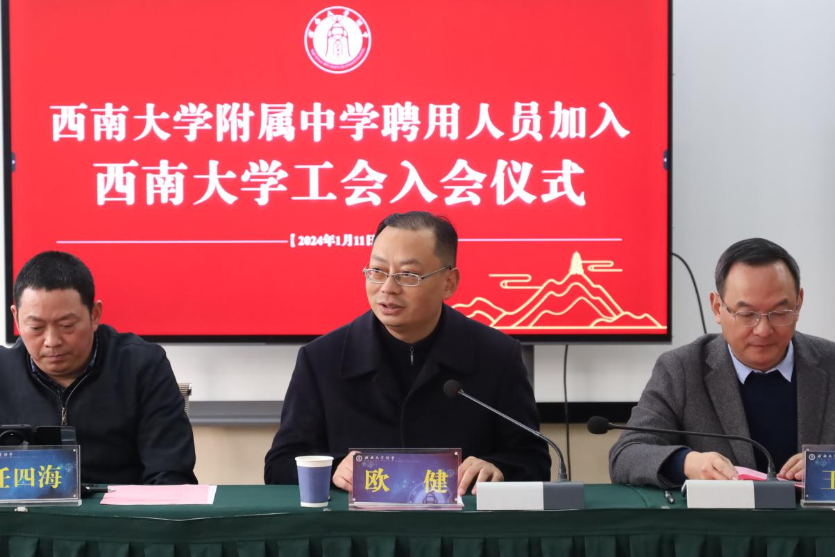 仪式上,学校党委书记欧健介绍了聘用人员的相关情况,他代表学校党委、行政和校工会对新进教职工表示热烈欢迎,并提出三点希望:一是希望牢记为党育人、为国育才的初心和使命,树立“躬耕教坛、强国有我”的志向和抱负,始终保持昂扬向上的精神状态;二是希望牢牢把握学校党建工作与事业发展融合的机遇,练就过硬本领,积极参与到学校的民主建设;三是希望积极参与和谐家园建设等工会活动,增强入会责任感。他希望全体新进老师,在用心用情用力助推学校事业高质量发展这个大目标实现的同时,如愿达成个人成长的一个个小目标,在这个过程中,把初心使命践行好,把志向抱负展示好,把学识本领历练好,把情怀情操涵养好,把美好生活编织好。