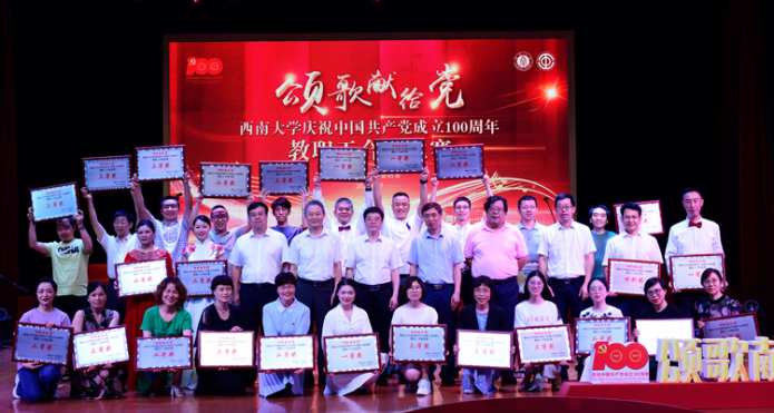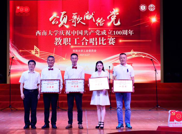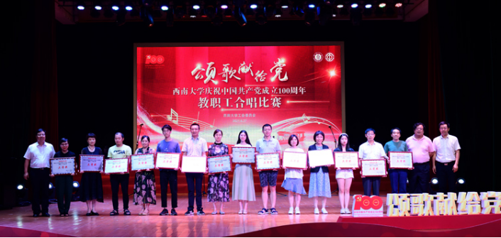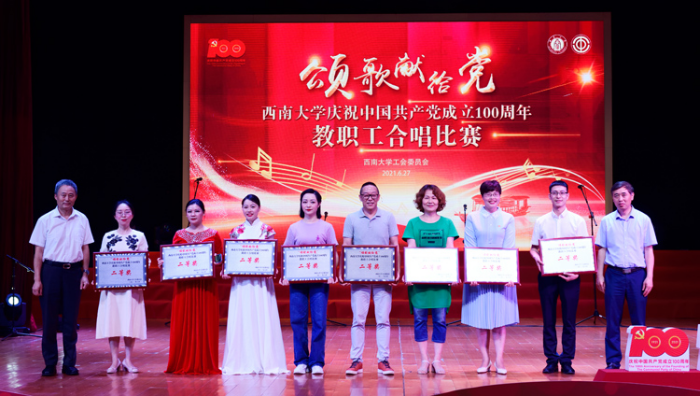 最后,比赛在音乐学院教职工合唱团带来的表演曲目《人民丹心》和《绣红旗》的歌声中圆满结束,机关工会、后勤保障部工会、培训与网络继续教育学院工会、体育学院工会获得一等奖;计算机与信息科学学院工会、附属中学工会、教育学部工会、实验幼儿园工会、图书馆工会、材料与能源学院工会、农学与生物科技学院工会、经济管理学院工会获得二等奖;校医院工会、国家治理学院工会、物理科学与技术学院工会、化学化工学院工会、文学院工会、园艺园林学院工会、电子信息工程学院工会、食品科学学院工会、生命科学学院工会、动物科学技术学院工会、药学院工会、法学院工会、柑桔研究所工会、新闻传媒学院工会获得三等奖。各合唱队精心准备,在高亢嘹亮的歌声中回望中国共产党栉风沐雨的漫漫征途,颂扬中国共产党波澜壮阔的峥嵘岁月,以朝气蓬勃的青春风姿展望壮阔美好的新时代,为全校师生带来了一场红色音乐盛宴。
