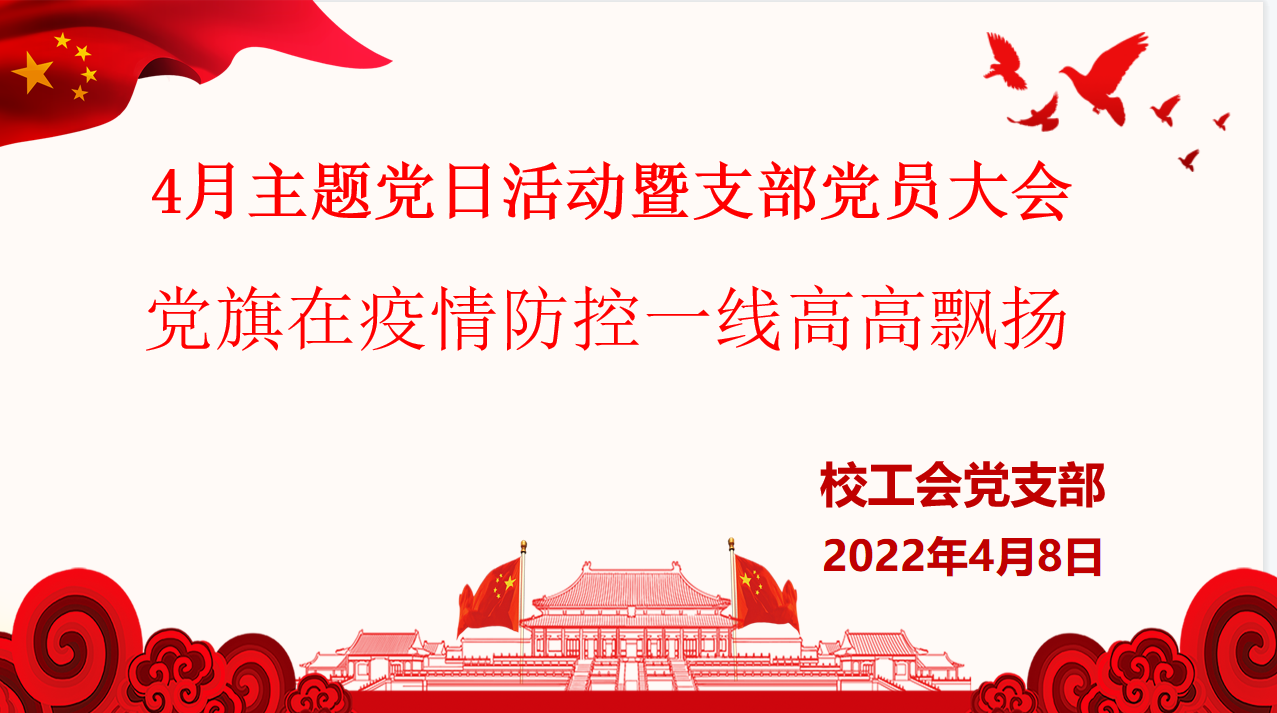 2022年4月8日(星期五)上午10:00,校工会全体党员同志在工会208会议室开展了主题为“党旗在疫情防控一线高高飘扬”的党支部主题党日活动。全体党员同志集中缴纳4月份党费。李玉兰同志传达了4月7日机关党委支部书记会议精神,并带领党员集中学习了“习近平总书记3月17日在中共中央政治局常务委员会会议上的重要讲话精神”,观看了《焦点访谈》专题视频《从严从实 科学精准》,学习了疫情安全防护知识。