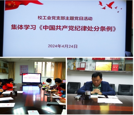 2024年4月24日14:30,校工会党支部全体党员在工会208会议室开展专题学习《中国共产党纪律处分条例》主题党日活动,会议由支部书记赵子华主持。