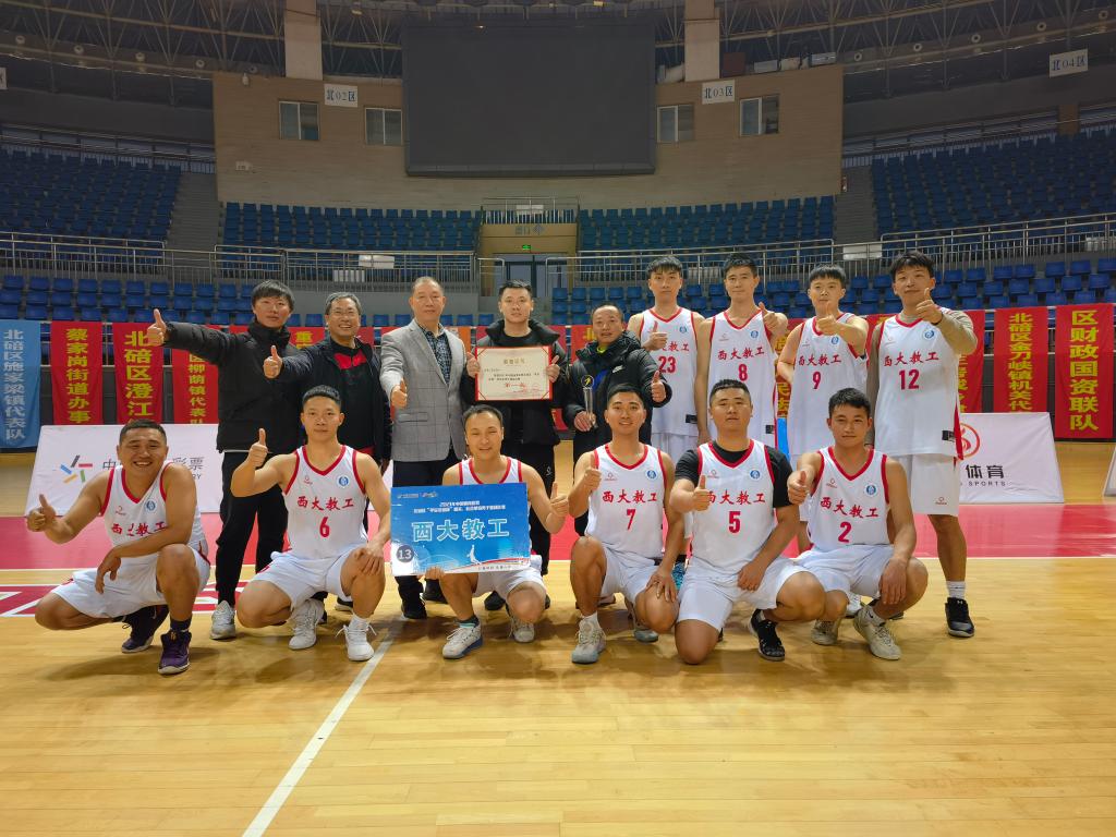 赛后由北碚区委常委、政法委书记苟鹏为教工队颁发了奖杯及证书,祝贺教工队赛出了高水平,赛出了风格,并邀约多开展区校之间的篮球交流互动。