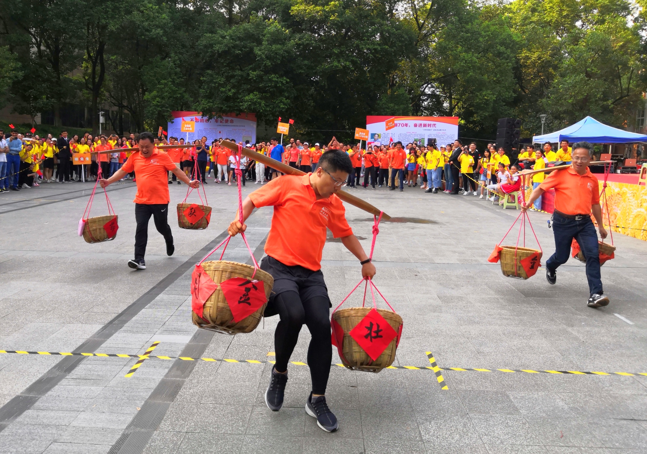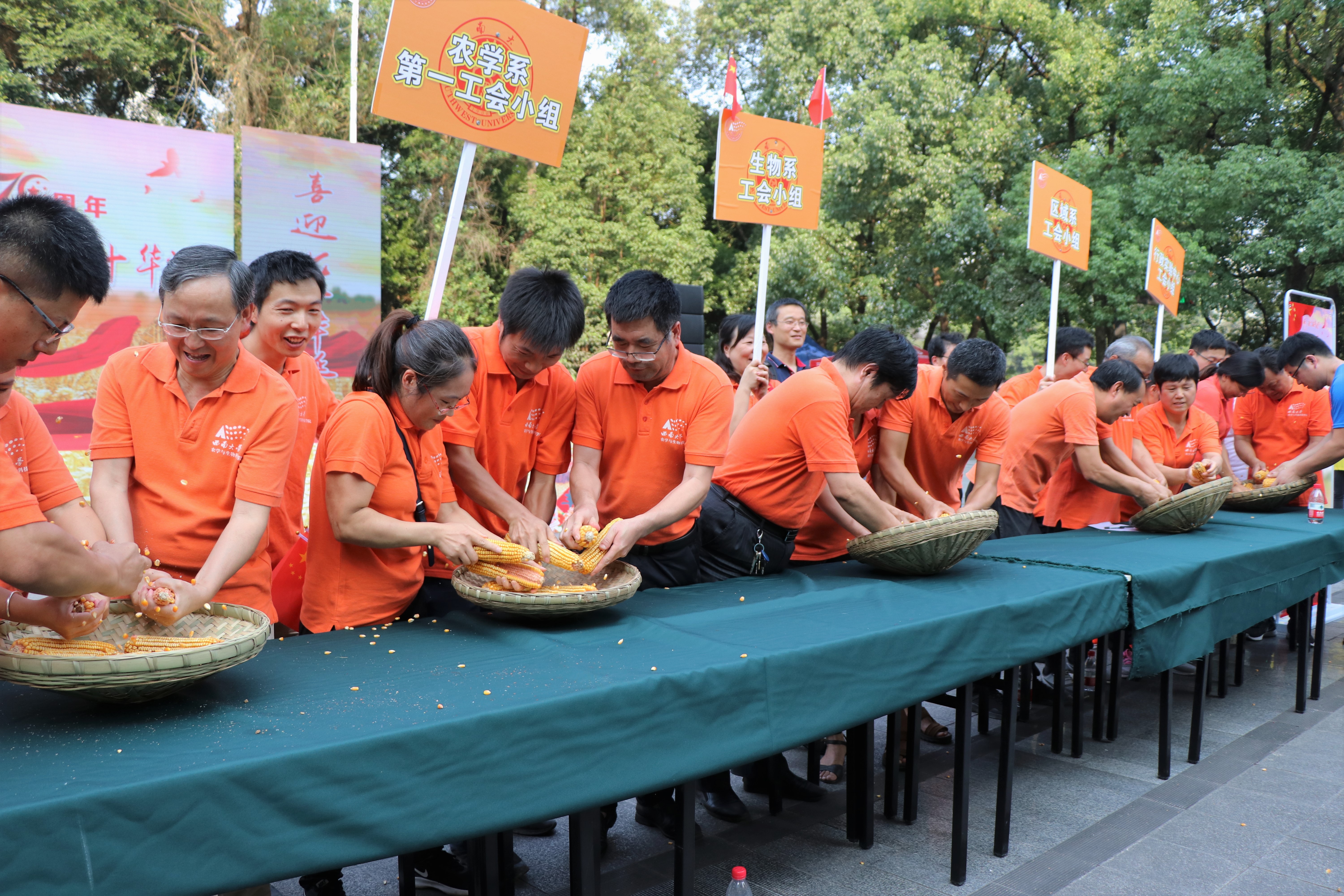 农事竞赛环节是活动的高潮。农科师生日常的工作被设计成比赛内容,“金玉满堂”、“颗粒归仓”、“浑水摸鱼”等游戏,既比拼职业技能又生动有趣。名为“金玉满堂”的掰玉米粒比赛,是玉米考种的枯燥活儿,演变成比赛项目后增加了许多竞赛乐趣。另一个赛场,老师们肩挑着盛满粮食的箩筐正在拼速度,看谁先把粮食送回“仓库”,他们熟练地挑着压弯的扁担疾步奔跑,欢快溢颜于表。尖叫声此起彼伏的“浑水摸鱼”比赛,水花四溅,眼疾手快的队伍抓得个盆满钵满,喜笑颜开。