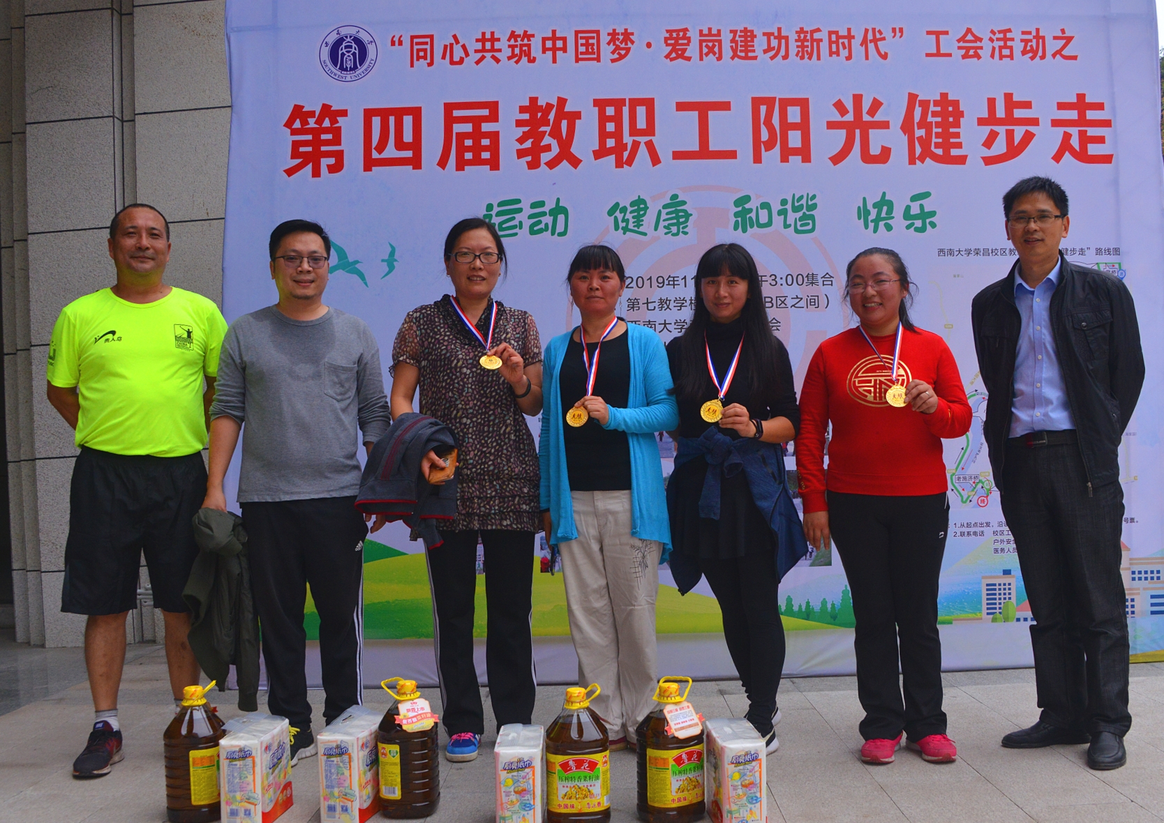 为了推动全民健身运动,促进“健康校园”建设,11月1日下午,由校区工会、校区体委主办,各学院、部门工会协办的第四届教职工“阳光健步走”活动在校区进行,活动的主题为“运动、健康、快乐、和谐”,校区在家的教职工参加了此次活动。