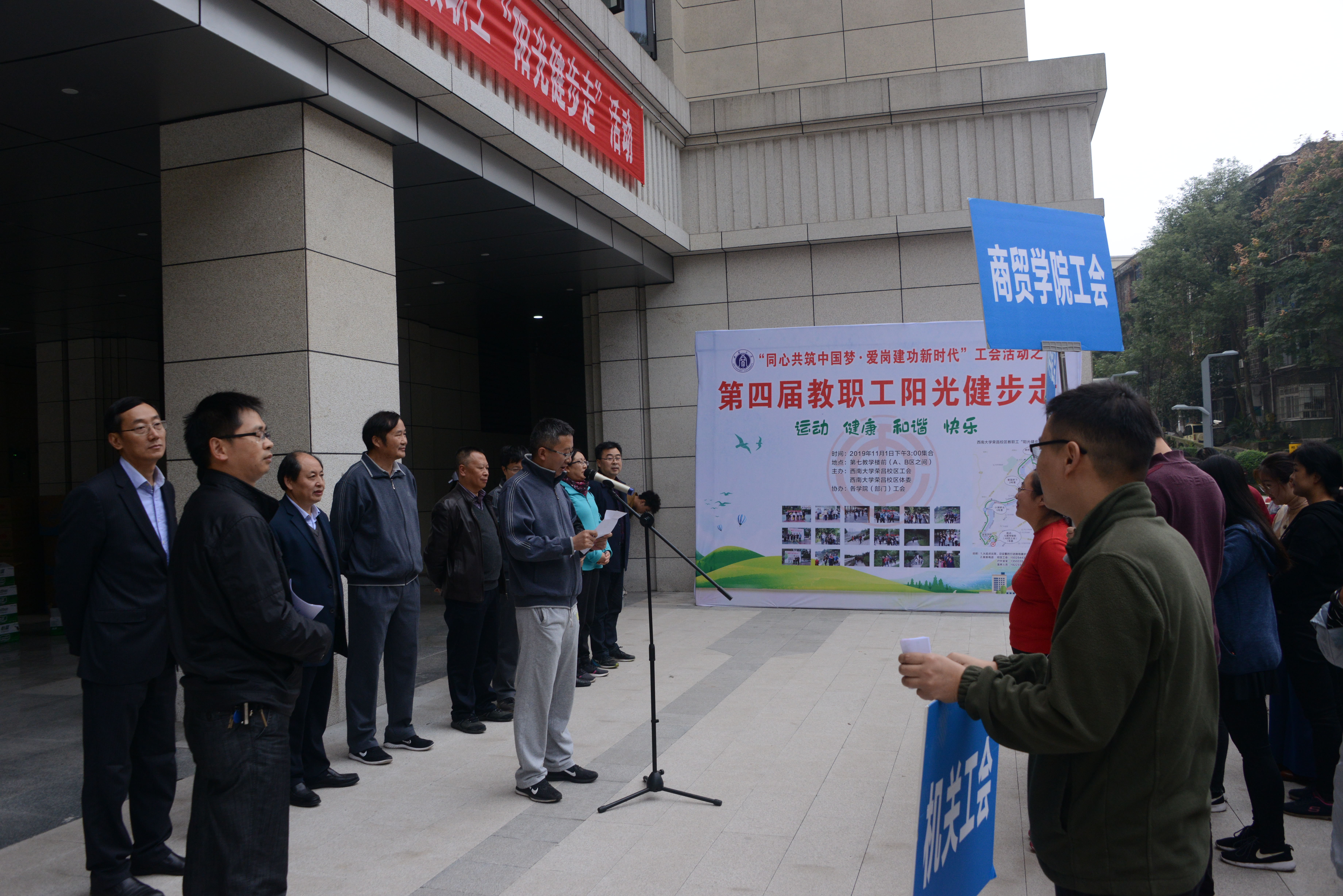 校区党工委副书记魏培修同志在活动开幕式上讲话,代表校区党工委、管委会对活动的举办表示热烈祝贺!对为校区建设发展付出辛勤劳动的全体师生员工表示衷心的感谢!魏培修副书记说,校区工会围绕中心工作,认真履行工会职能和教代会职权,积极营造温馨“职工之家”做了大量工作。学校第三次党代会的召开,标志着学校全面开启建设特色鲜明的世界一流大学和荣昌校区提质扩容新目标,站在新的发展起点上,希望校区工会进一步团结带领全体教职工,遵照“同心共筑中国梦·爱岗建功新时代”的要求,努力为新目标的实现添砖加瓦;希望全体教职工通过“阳光健步走”活动,从运动中收获快乐、感受集体温暖、同事的友谊!