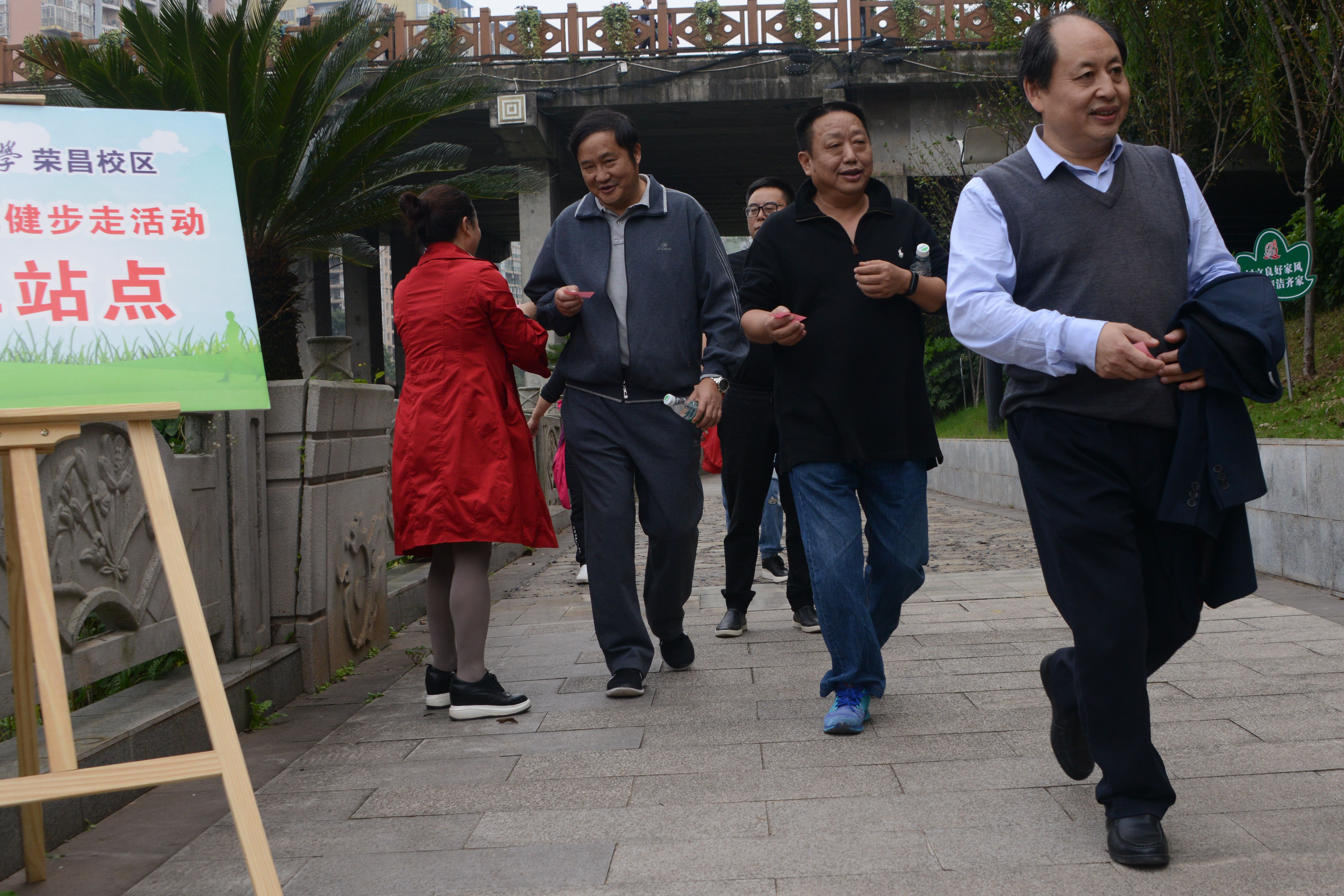 随着校区管委会主任左福元同志的一声“出发”令下,老师们迈开矫健的步伐从怀乡广场出发,沿着濑溪河畔行进,大家沐浴着冬日阳光,一路上谈笑风生,或聊工作,或谈生活,十分惬意。绝大多数老师圆满完成了从怀乡广场至廊桥段的健步行走,往返路程约9公里。