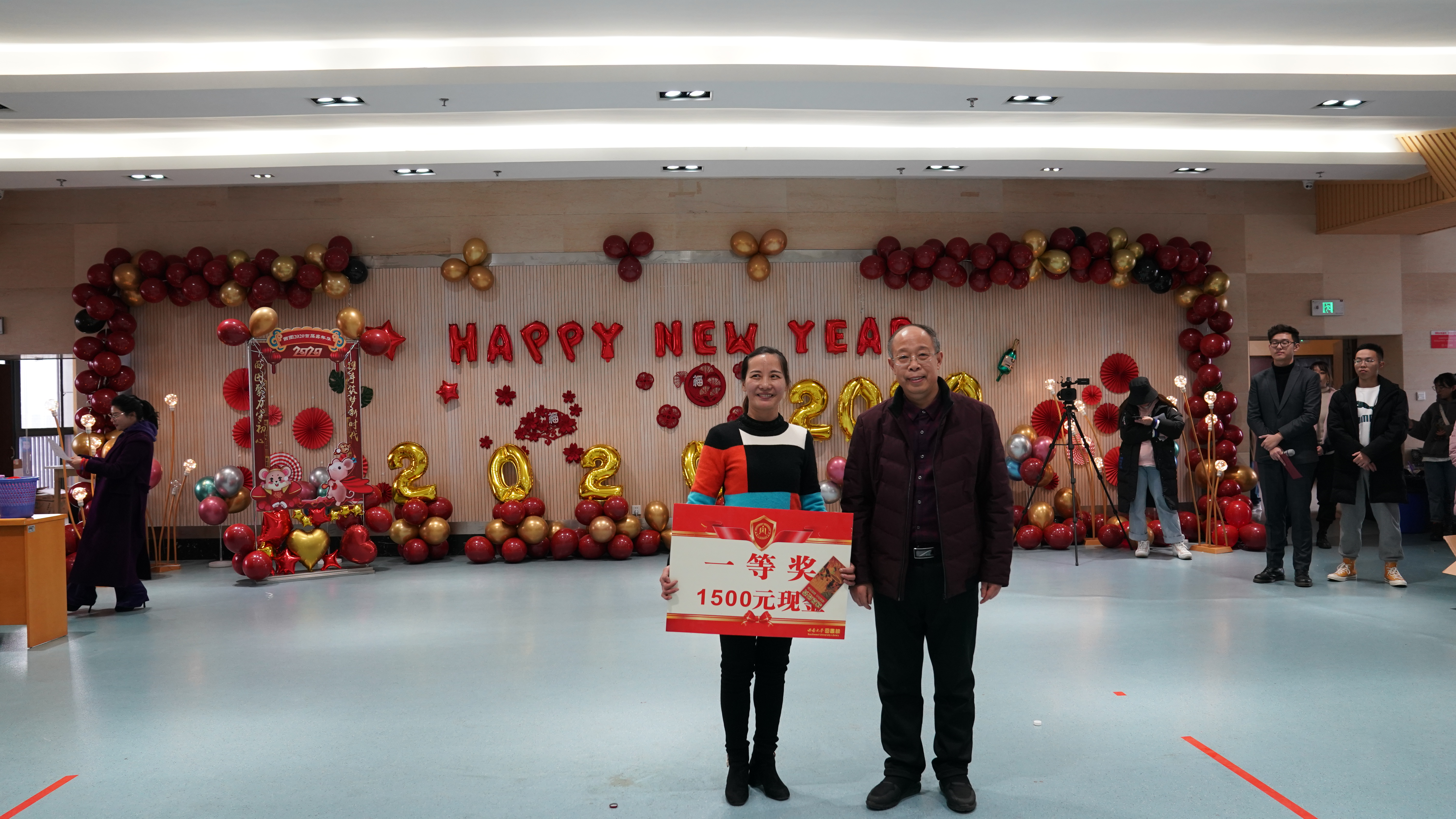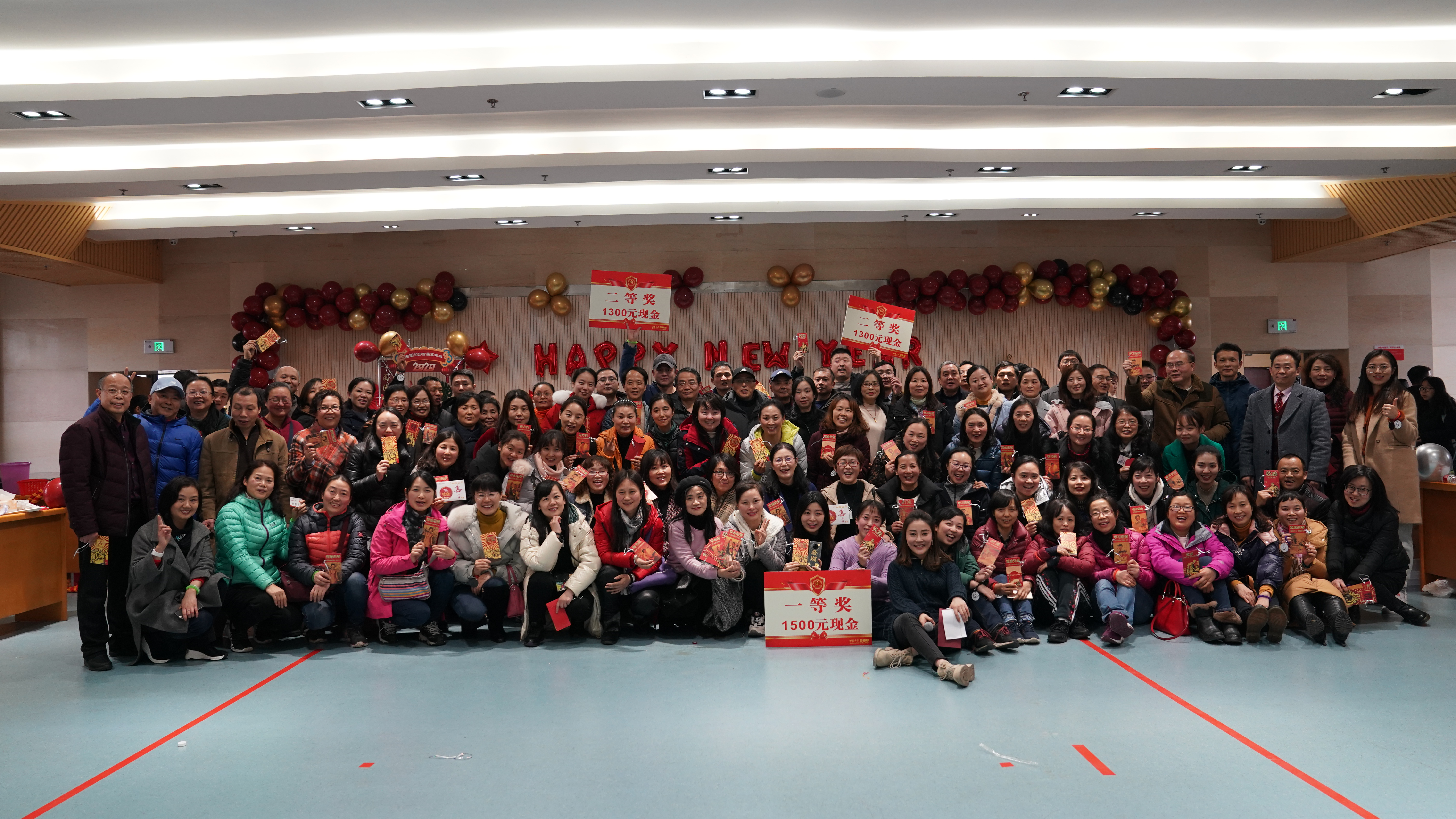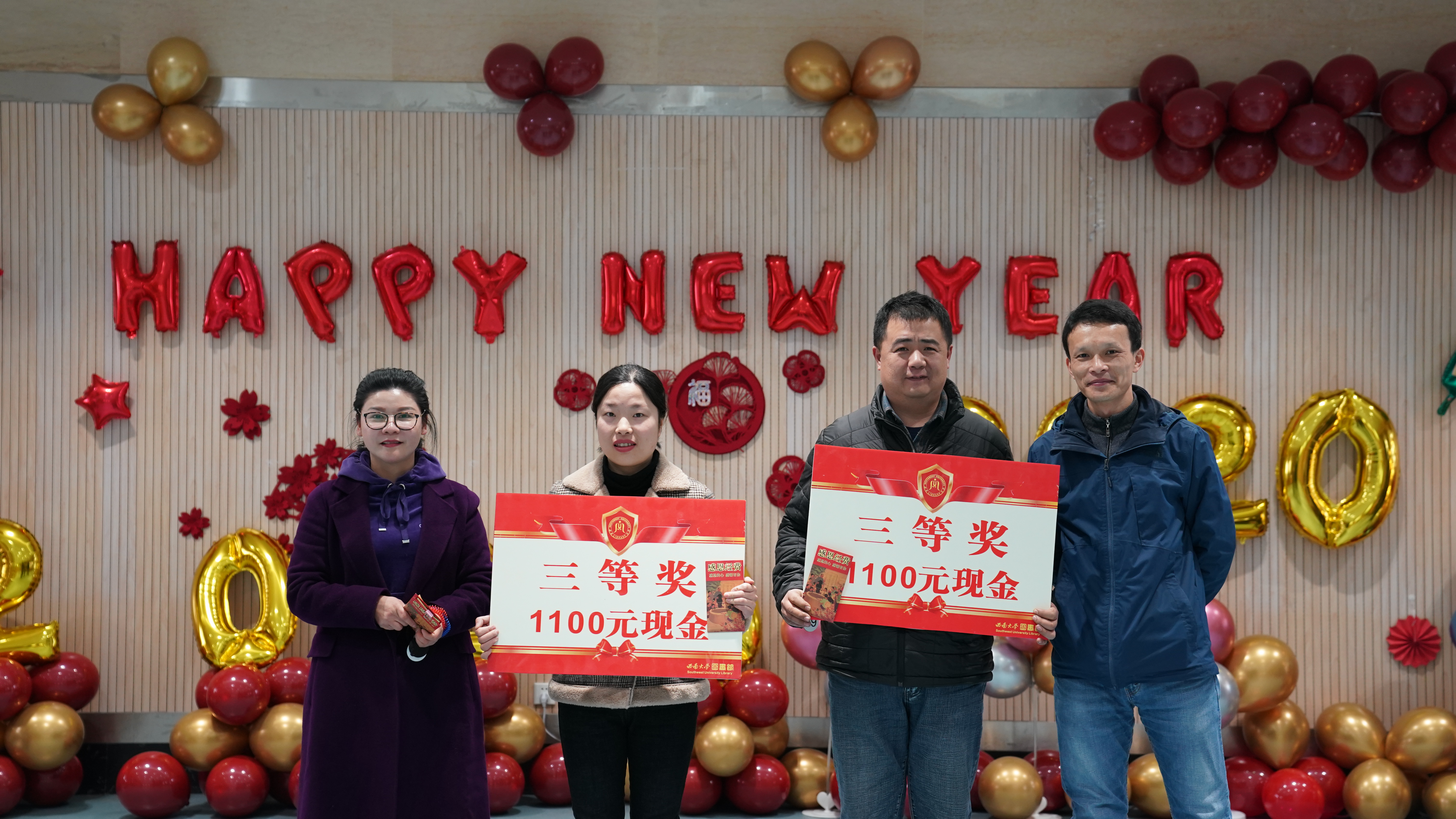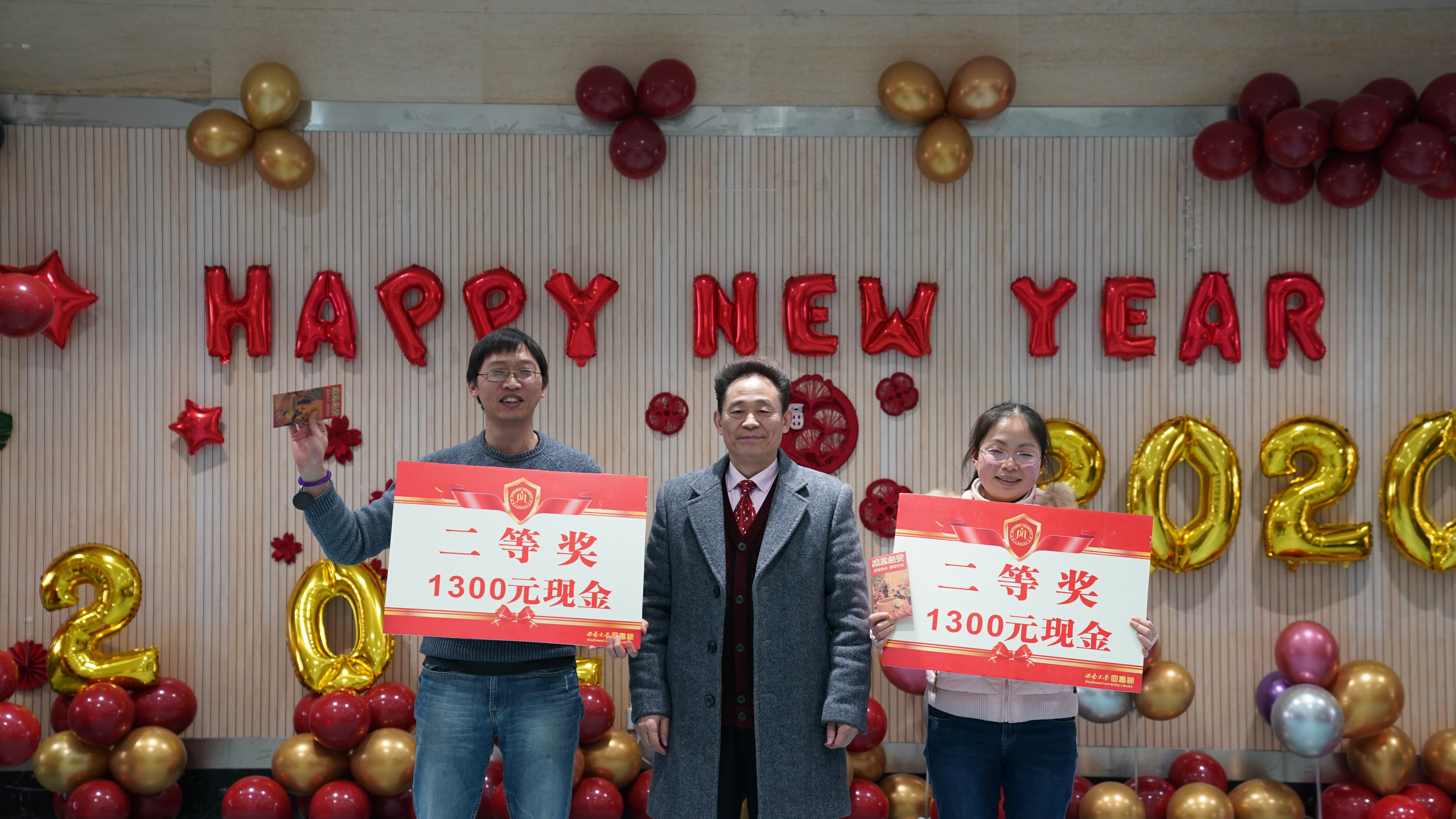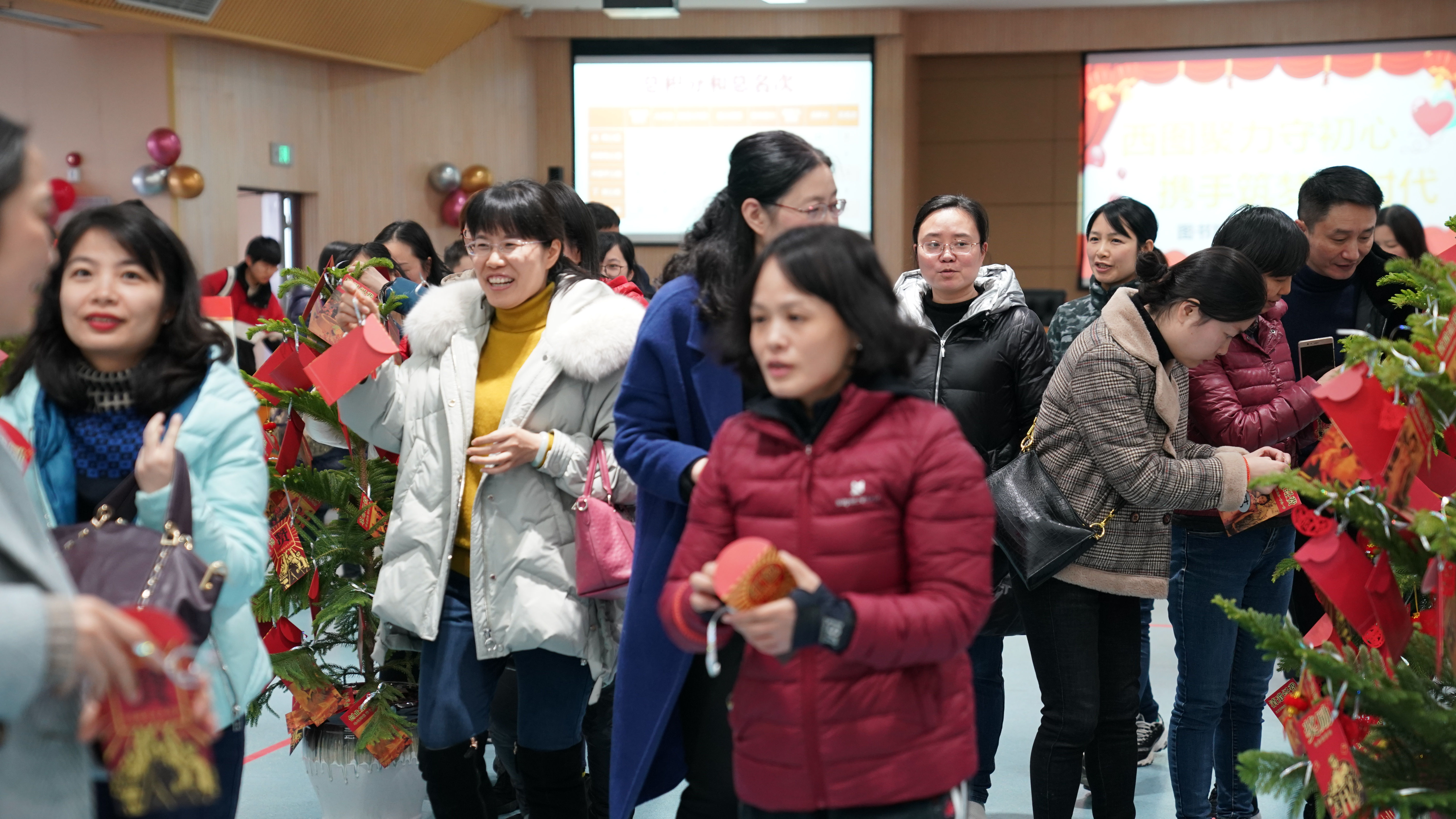 结束了欢乐的游戏环节,现场迎来了最受欢迎的抽奖环节,图书馆七部一室一所的部门主任和党政领导班子先后从抽奖箱中抓出了若干写着会员手牌号码的乒乓球,惊喜连连,馆员们都喜不自胜。最后是激动人心的颁奖环节,五个工会小组在比赛过程中各显神通,最终第三工会小组以三项赛事第一的优异成绩夺得一等奖,第一工会小组和第四工会小组位列了二等奖,第二工会小组和第五工会小组获得了三等奖。工会组长们在组员们期待的眼神中从领导手里接过了奖牌和奖金,馆员们依次从挂满红包和各式各样“福”字的幸福树上摘下一个个“幸福红包”,现场一片欢腾。