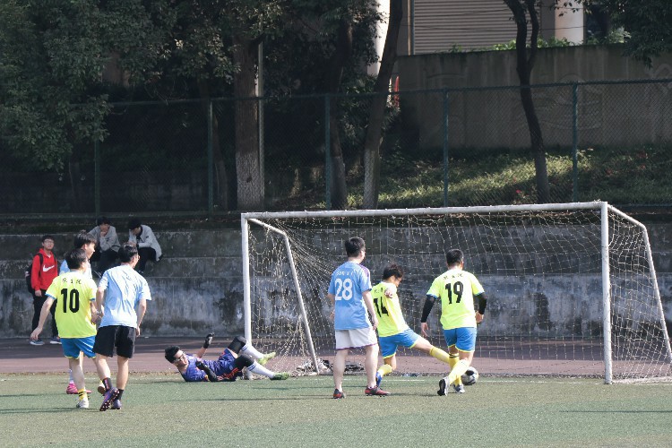 足球比赛上场队员多,且对体能和技术要求高。对一个学院而言,单独组建一支足球队是非常有难度的。杜海教授的召集令一发出,16名老师转瞬就成立了一支足球队。迅速购置装备后,立即举行了学院师生联谊赛。赛场上不乏看点,精彩连连,加油呐喊声不断。为弥补体能不足,老师们轮番上场,最终借技术优势以4比3小胜学生队。