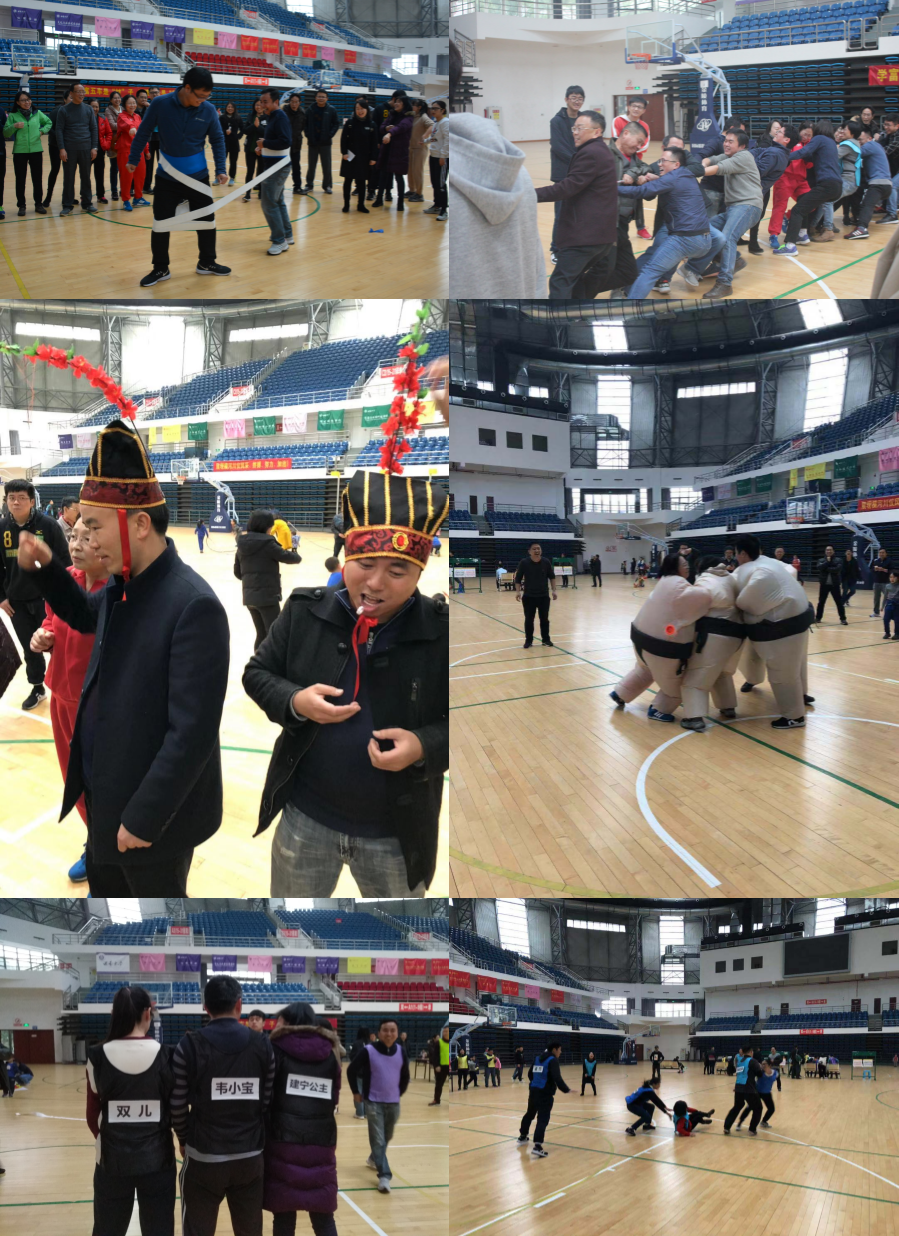 在此次活动上,共有7个项目:戴帽子吃糖、拔河、传送带、躲避弹力球、胖子相扑、撕名牌以及趣味接力(抖便利贴、矿泉水瓶插筷子和你画我猜)。戴帽子吃糖让大家体会了“无法下口的甜蜜”;传送带要求队员同步旋转并在眩晕中防止传送带裹腿;躲避弹力球要求参赛队员做到眼疾手快,要么及时躲避球,要么成功接住球;拔河、胖子相扑和撕名牌环节异常激烈,场面十分热闹。