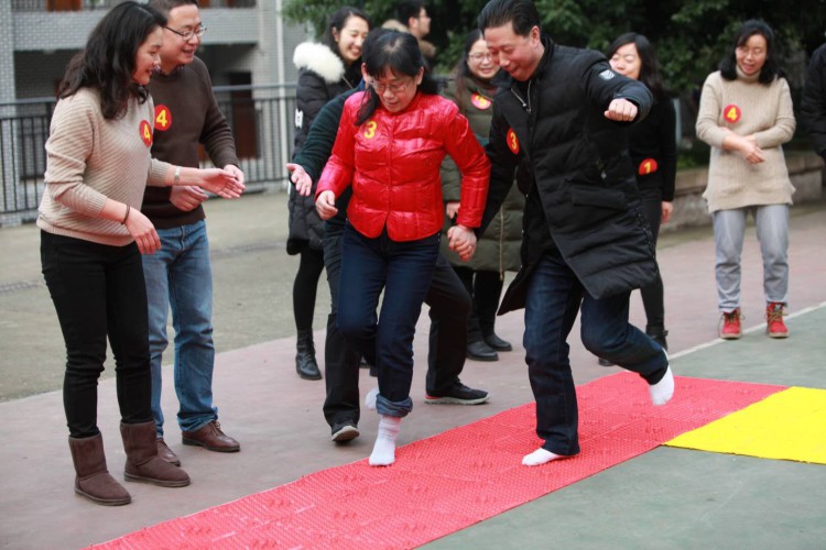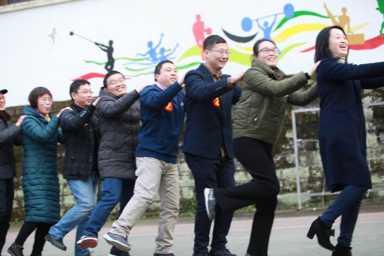 接下来是竞技活动,每队选出8位老师,1男1女组合,通过跳绳、两足跳、三连拍、顶气球、战地拔旗五个环节到达终点。参赛老师齐心协力,默契配合,全力以赴,其余的老师在场边加油助威,大家沉浸在一片欢乐的海洋中。