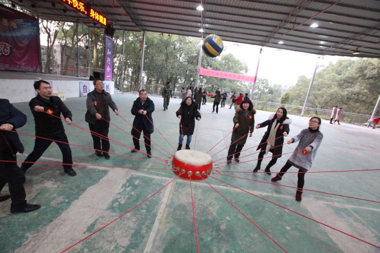 最后一个项目是同心鼓,顾名思义,就是全队老师心往一处想,劲往一处使,每人抓着长绳,将皮鼓上的排球颠起来,颠球数量最多的获胜。老师们同心协力,或左或右跑、或上或下拉,全场气氛异常活跃。