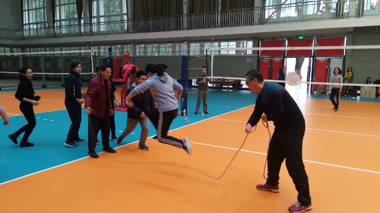 3分钟集体跳大绳比赛也紧锣密鼓地展开了,教师们用轻盈的身姿在绳来绳往间不断刷新着成绩。
