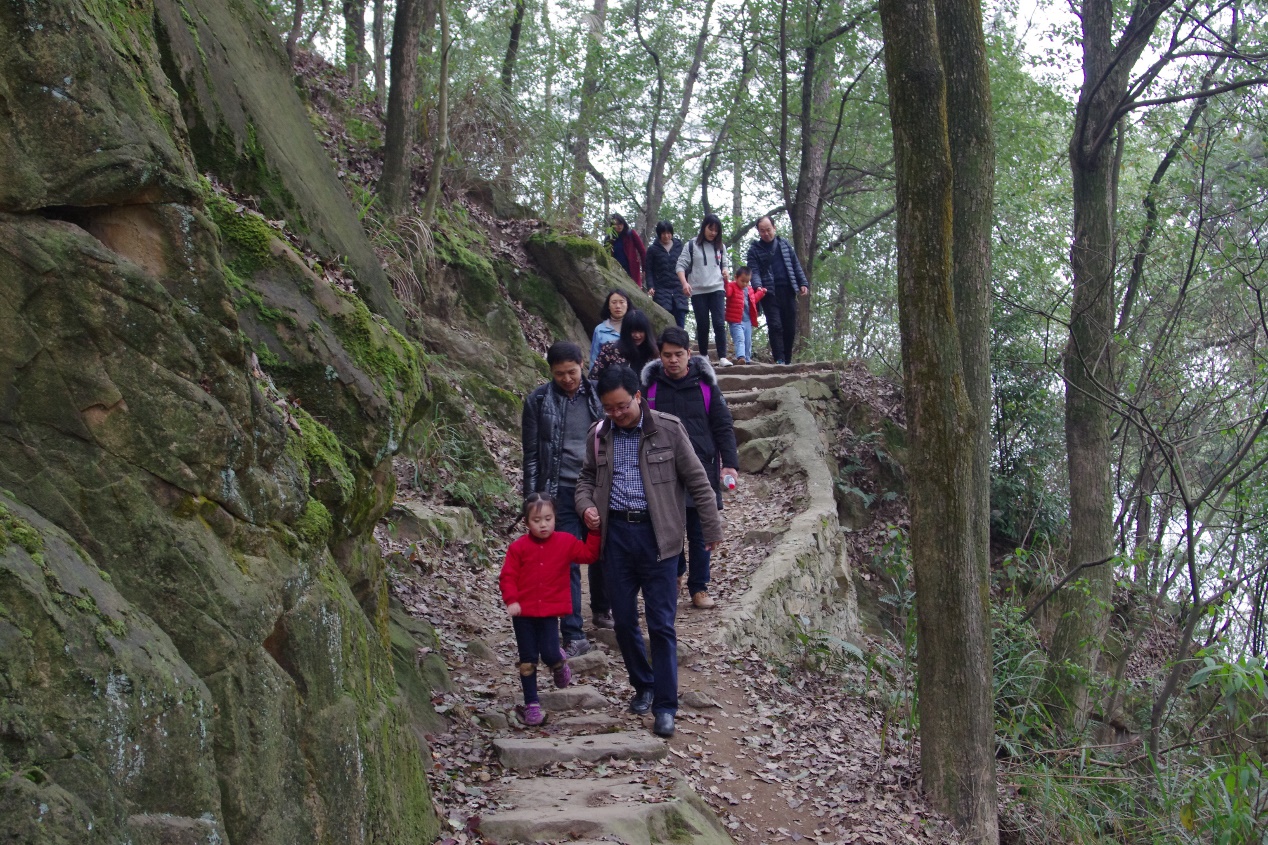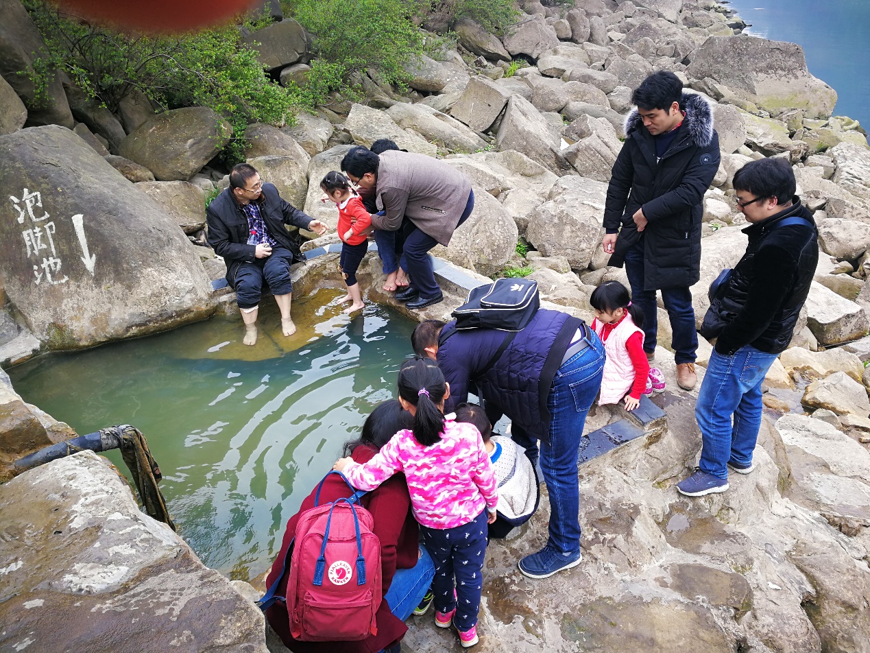 如今的温塘峡江水因上游草街电站大坝的拦截已没了往日咆哮奔腾、旋涡叠生的气势磅礴,呈现给大家的是轻盈流畅、碧波荡漾的别样温柔 ,但两岸依旧悬崖挺立,犹如刀劈斧削,粗犷与温婉竟然如此这般相得益彰。老师们行走在绿树掩映的古道中谈笑风生,不知不觉中来到了上山的千步梯下。步梯在悬崖峭壁上开凿而成,会令人望而生畏,但大家都信步而上,没有丝毫的犹豫,这要归功于半道上的二岩野温泉,或许是在温泉中泡脚给大家解除了之前的疲乏,重新获得了力量。