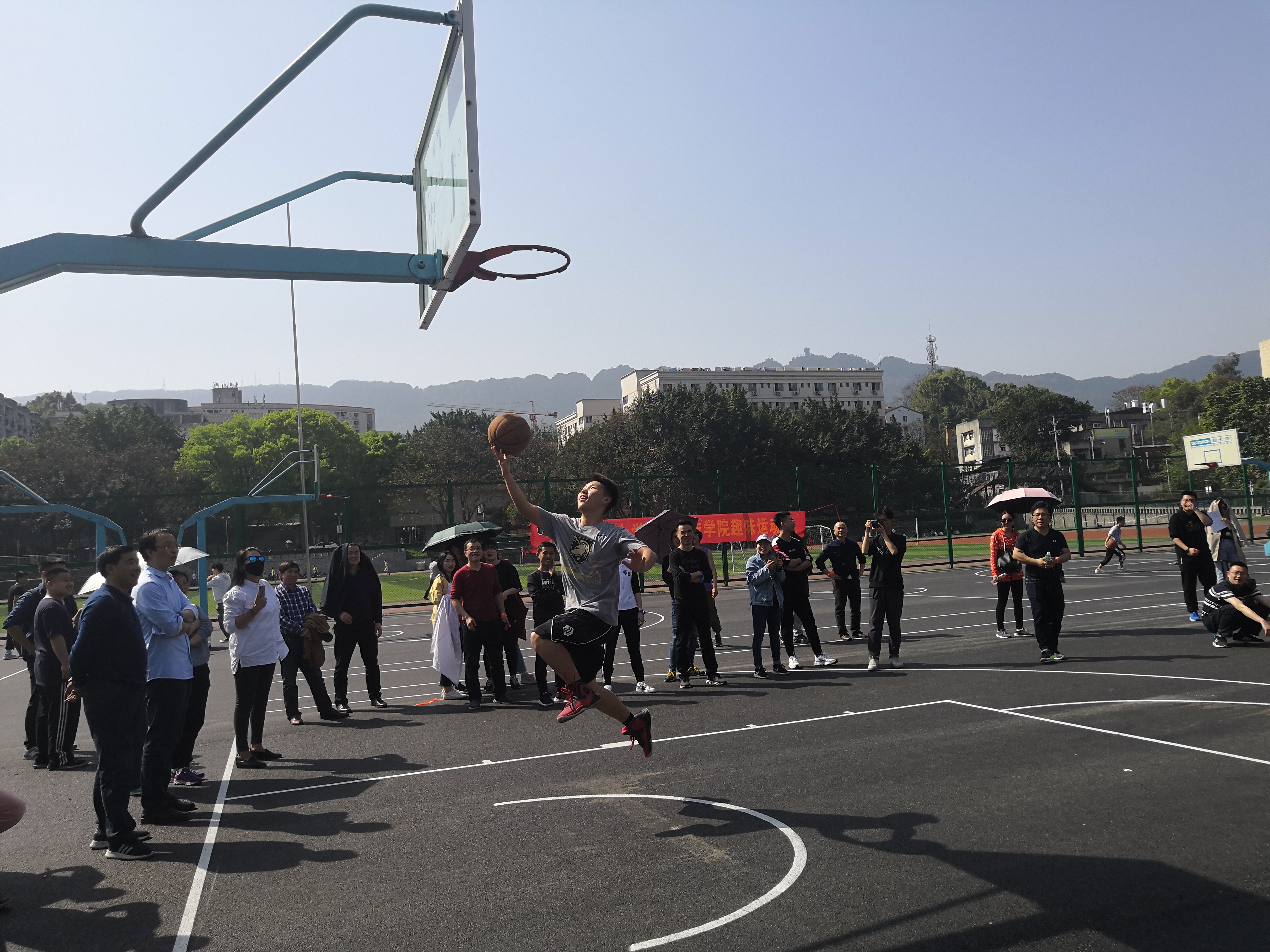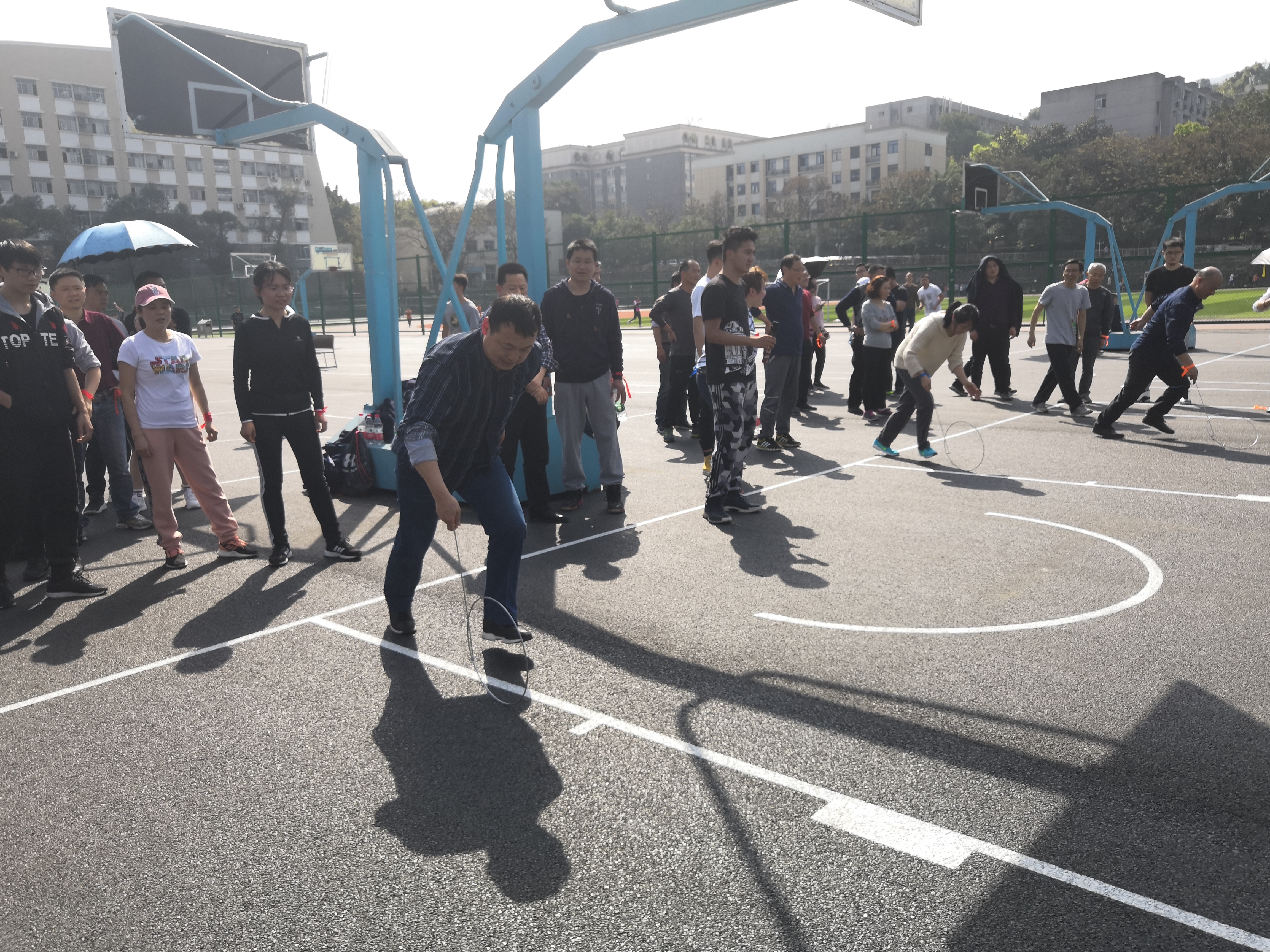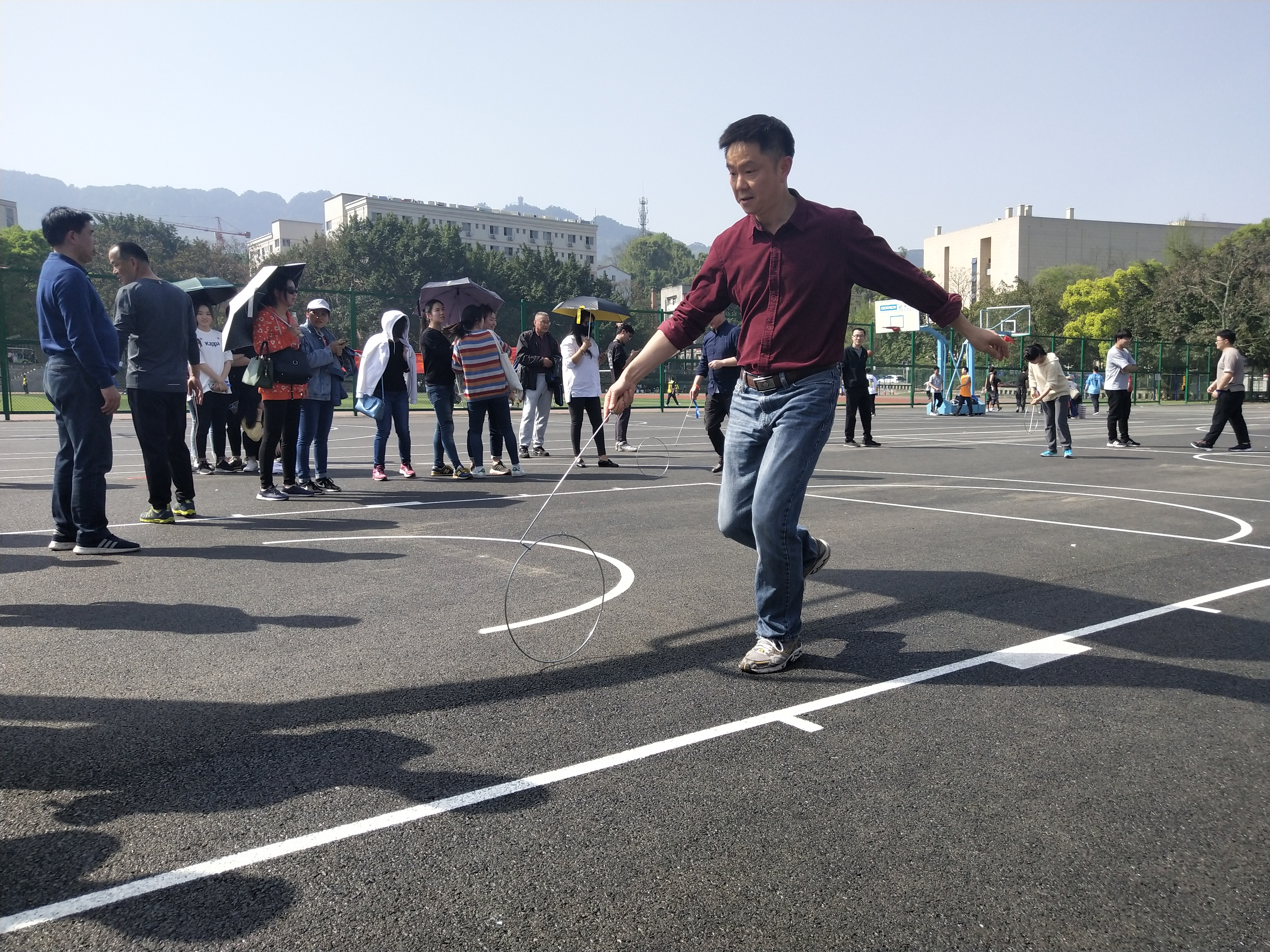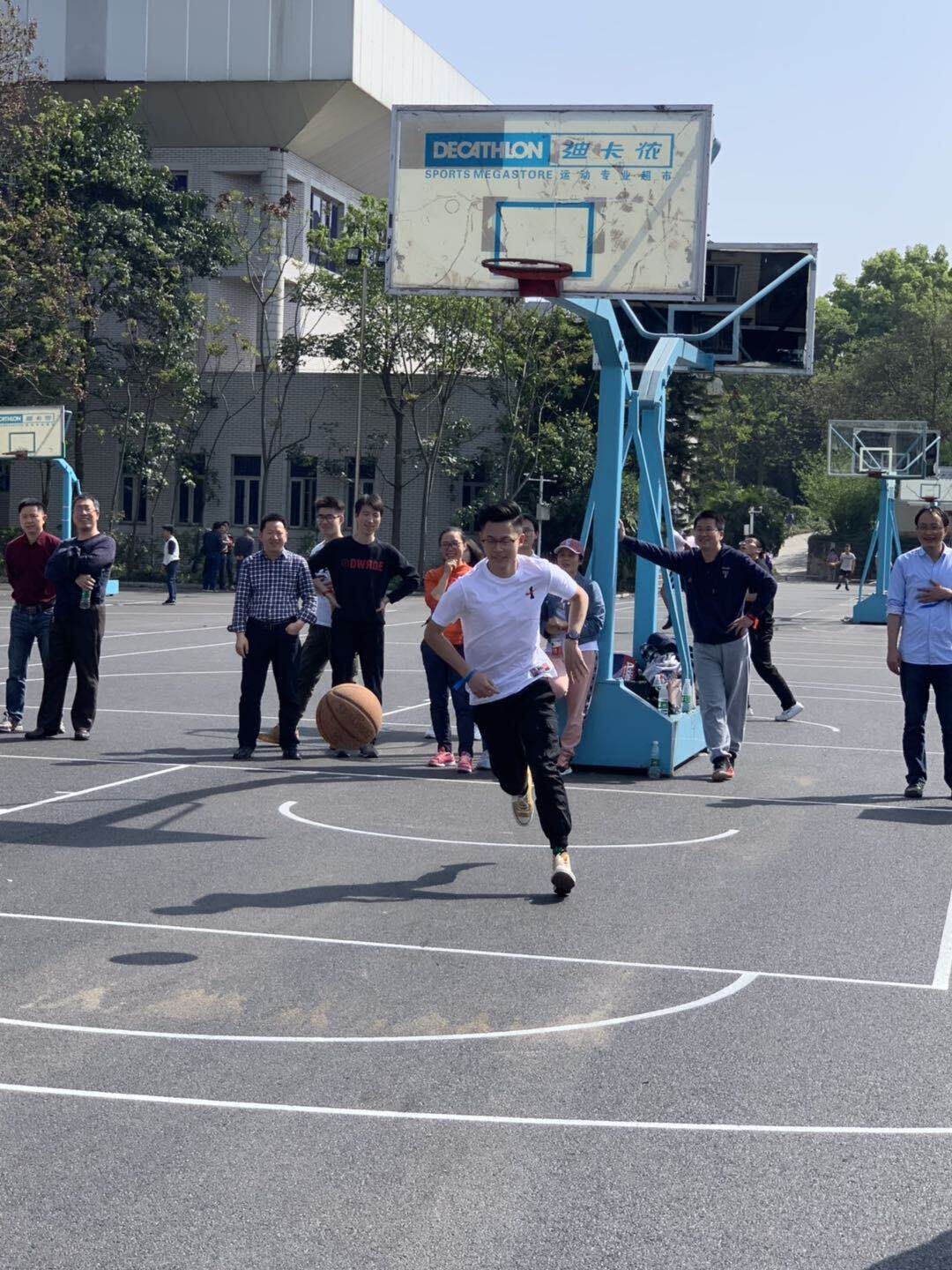 接着进行的是乒乓球接力、滚铁环比赛,每队参赛师生兴致勃勃,在声声的呐喊助威中,享受着竞技的快乐,体验着童真的乐趣。形式虽然很简单,但教师与学生完美的配合、不断总结经验也使大家取得良好的成绩。最后进行的是上篮接力比赛,这无疑是男生们的强项。对篮球的喜爱,集体的荣誉感是他们前进的动力,使他们都发挥了最好的水平。