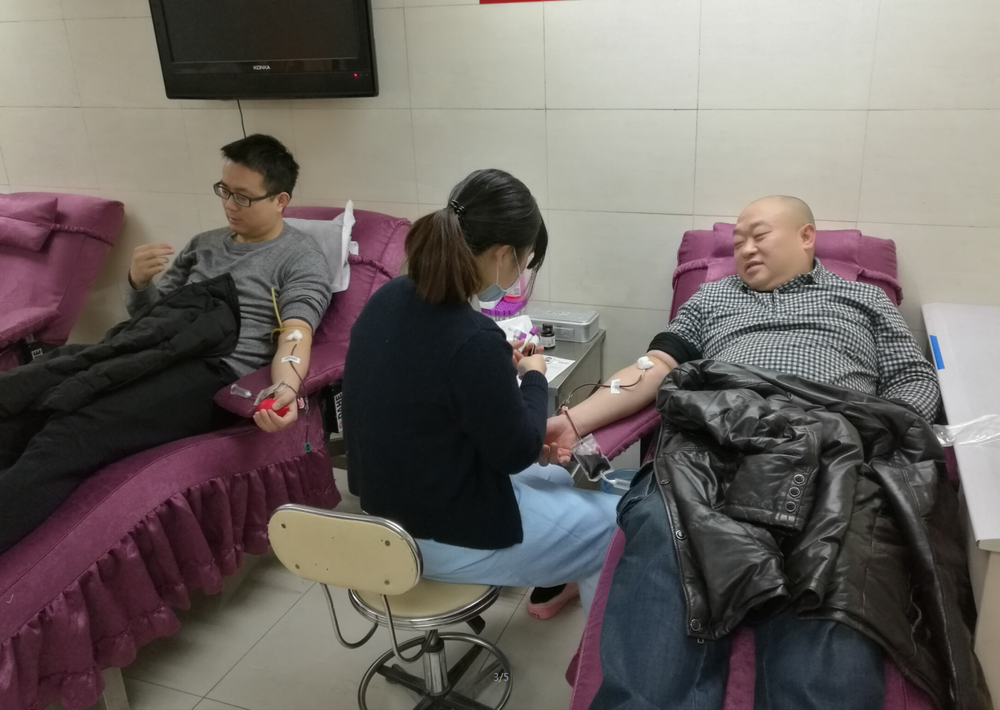 参加献血的郑持军、苏戟、刘凯、曾文、陈小芳5位同志到达医院后,接受了医学检查,最后郑持军、苏戟、刘凯三位同志为患者献血1000CC。5位同志无私奉献、托起了患者生的希望!“人间自有真情在”,出版社这个温暖的大家庭中,大家互爱互助,用行动诠释和提升了人间大爱。
