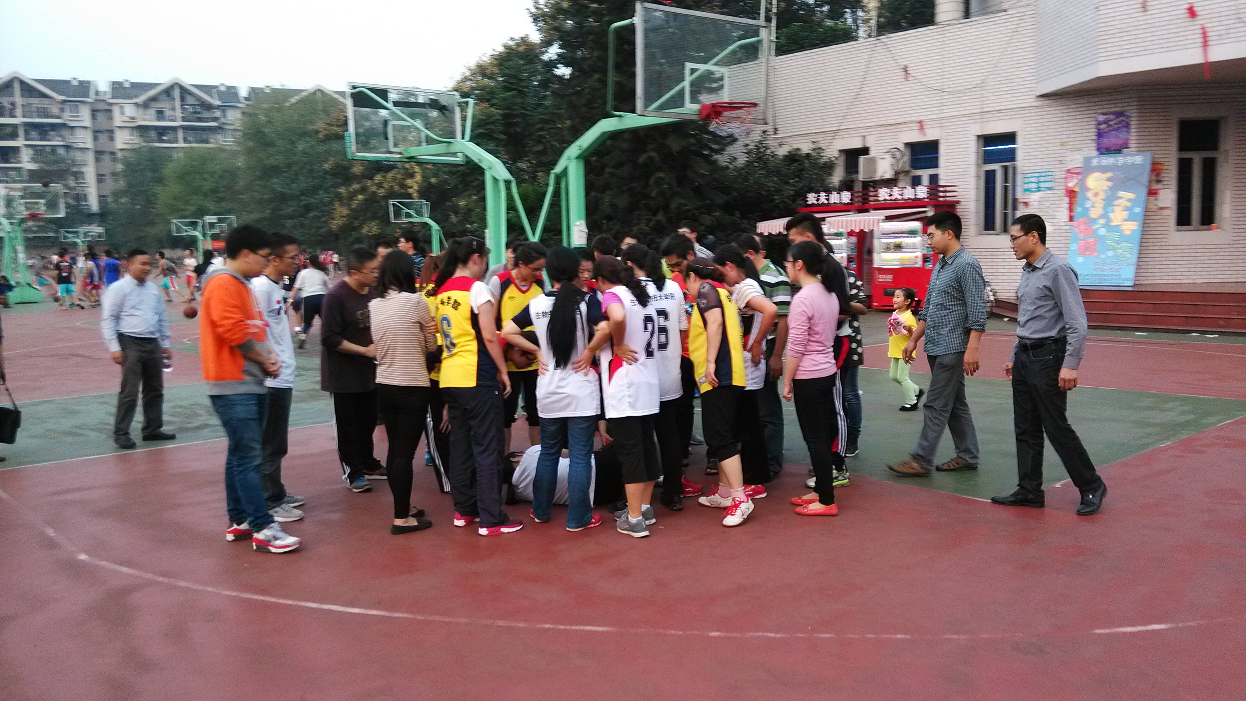 虽然比赛很激烈,但是材料学部的队员们发扬“友谊第一,比赛第二”的体育精神。在比赛快要结束的时候,对方球员在争抢篮板时,不慎扭伤了脚踝,材料学部的老师们第一时间拿出预备的跌打伤药,及时帮助对放老师处理伤情。