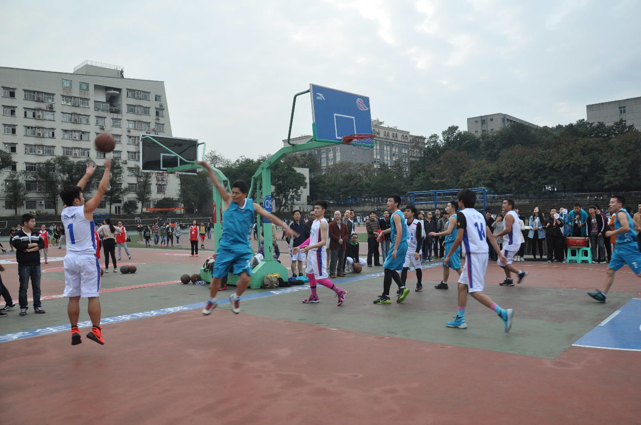 2015年11月1日下午4:40,我校第六届教职工篮球比赛淘汰赛继续打响,我院教职工男篮队伍今日迎来了强劲的对手---计信院教职工男篮。开赛之前淘汰赛紧张的气氛感染着在场每一位前来助阵的两方老师和学生,前来鼓劲加油的学生把两院的院旗和大鼓都搬到了现场,不断击鼓为双方运动员呐喊加油,现场气氛十分热烈,双方球员积极热身,不断投出好球,迎来现场阵阵欢呼,注定今天是一场精彩的赛事!