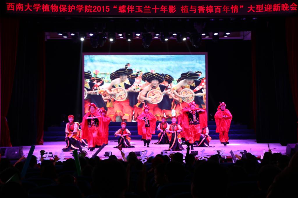 为了热烈欢迎2015级新生的到来,充分展现学院师生的风采,植物保护学院于2015年11月21日晚在PA视讯集团光大礼堂隆重举办了以“蝶伴玉兰十年影,植与香樟百年情”为主题的大型迎新晚会。学院工会特编排了彝族舞蹈《欢乐的彝家山寨》,组织了学院领导、教授及青年教师等14人参与表演,为刚步入学院的2015级莘莘学子献上了精彩的节目。