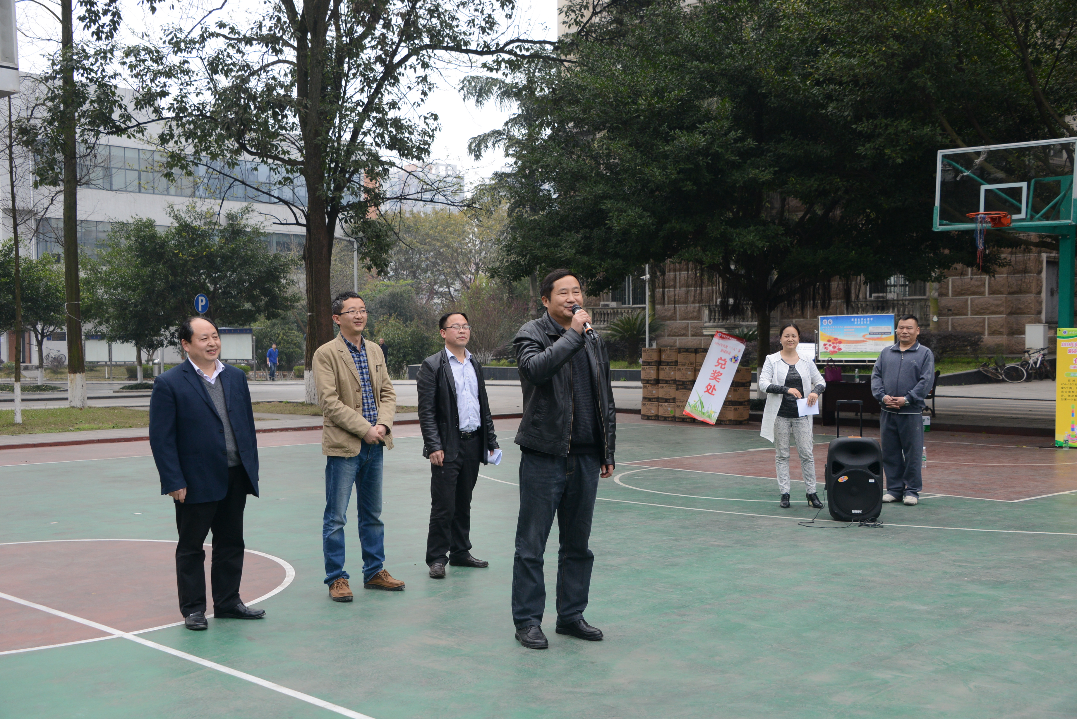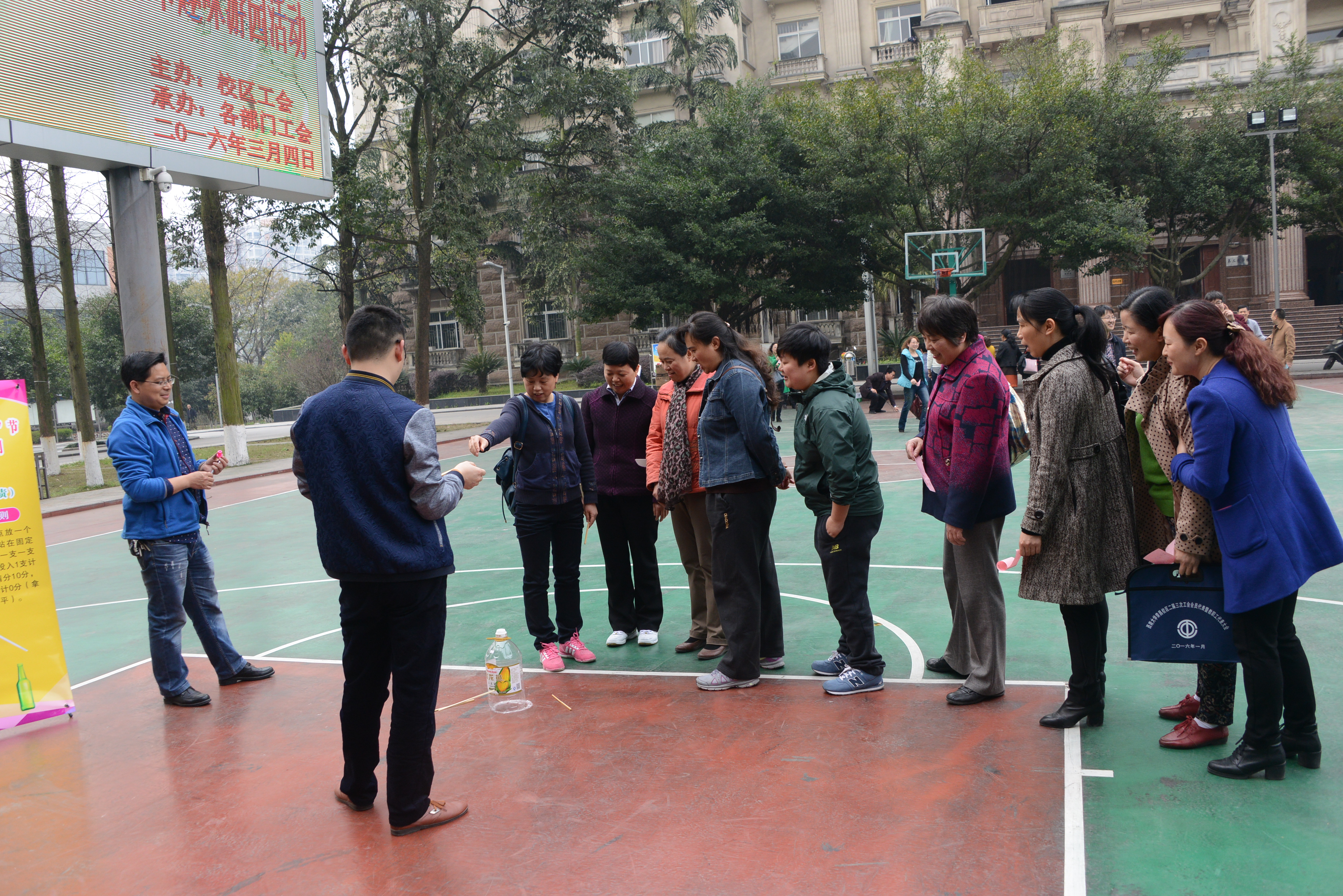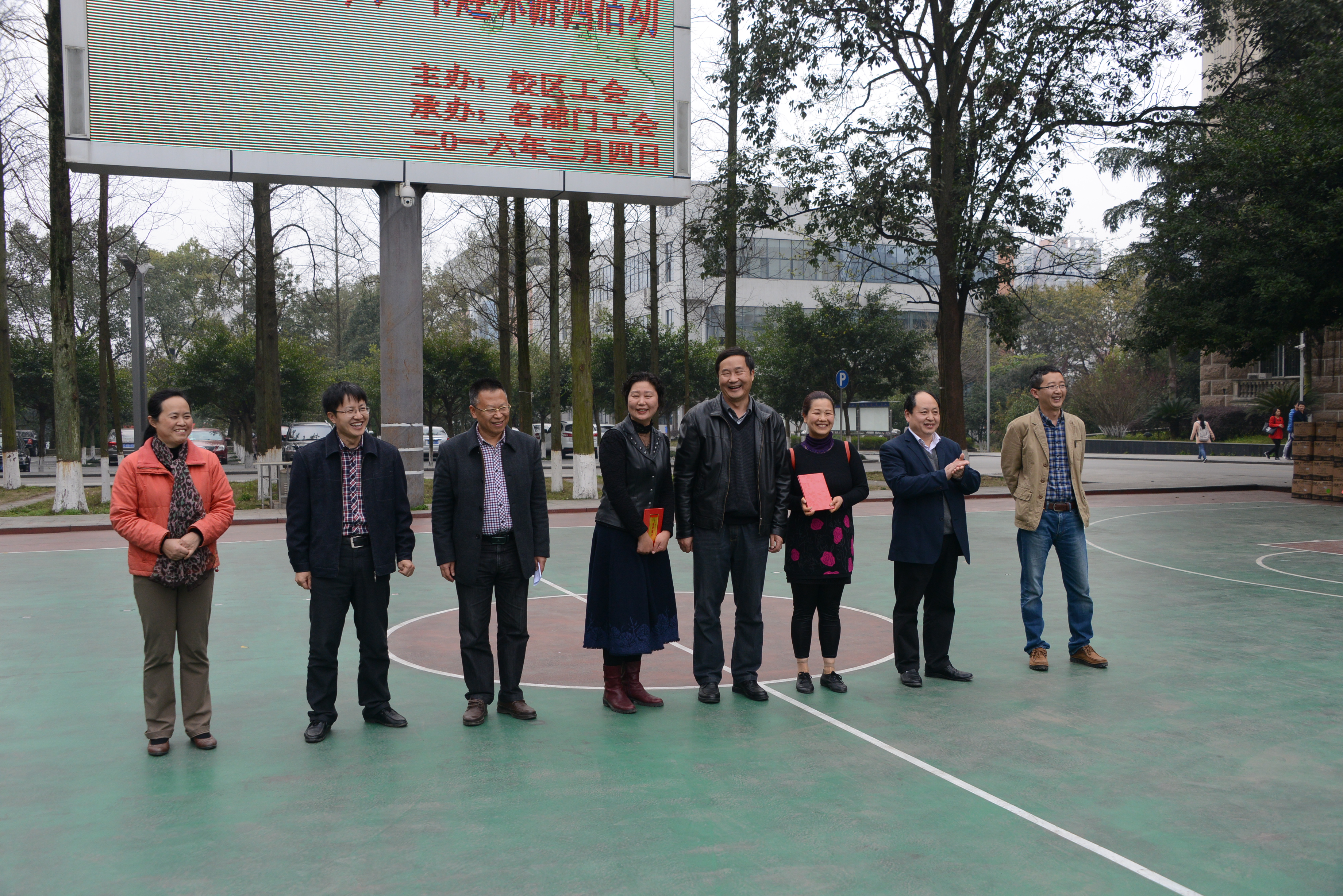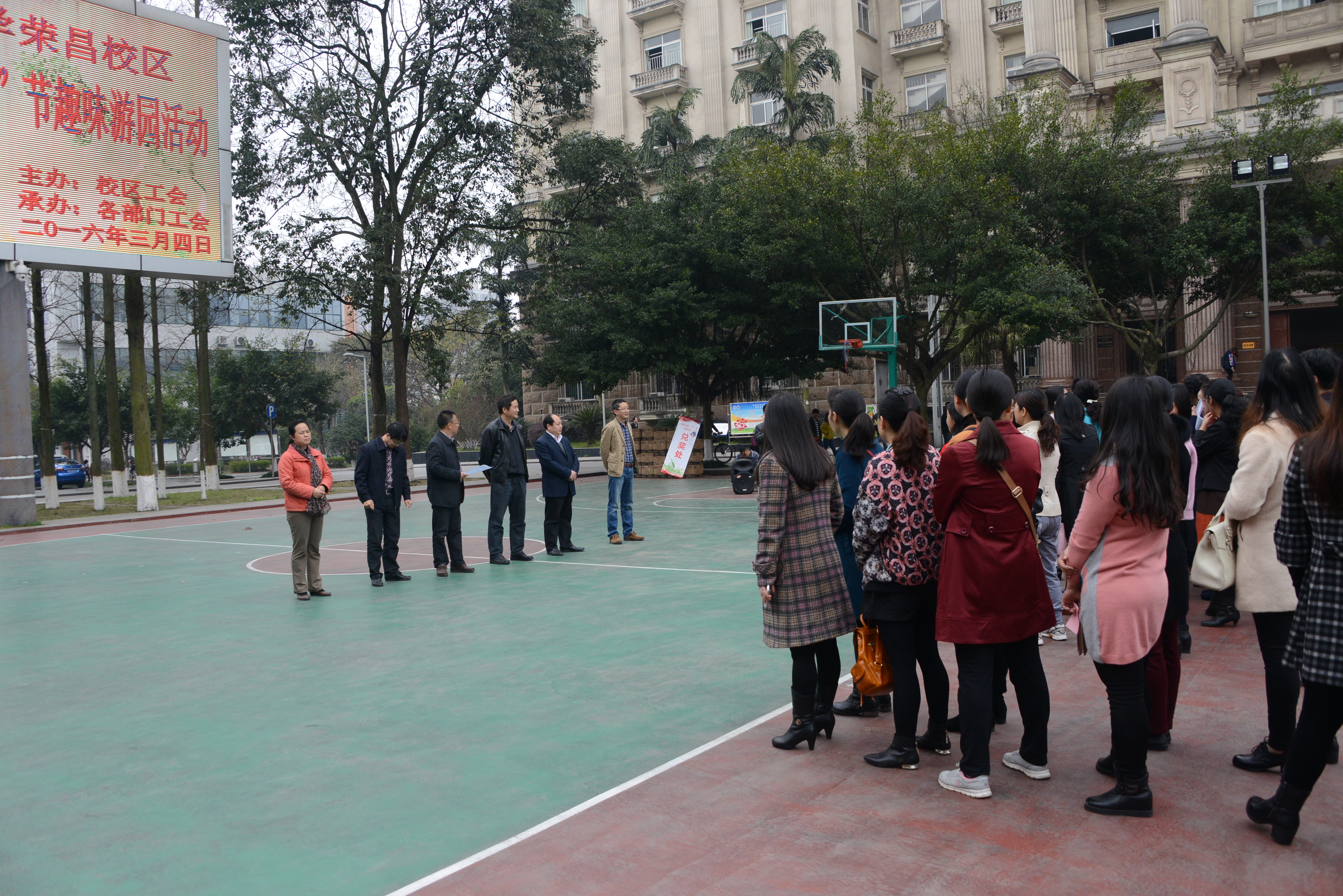 2016年3月4日下午,阳光明媚,春暖花开。校区工会在校区二教楼门前为全体女职工开展庆祝“三八节”趣味活动。参加活动有校区在职全体女职工,并邀请各级党政领导参加。校区管委会主任左福元,党工委副书记、纪工委书记周国安,管委会副主任朱汉春、赵智华、刘娟,党工委副书记魏培修出席并与女教职工一同参与庆祝活动。
