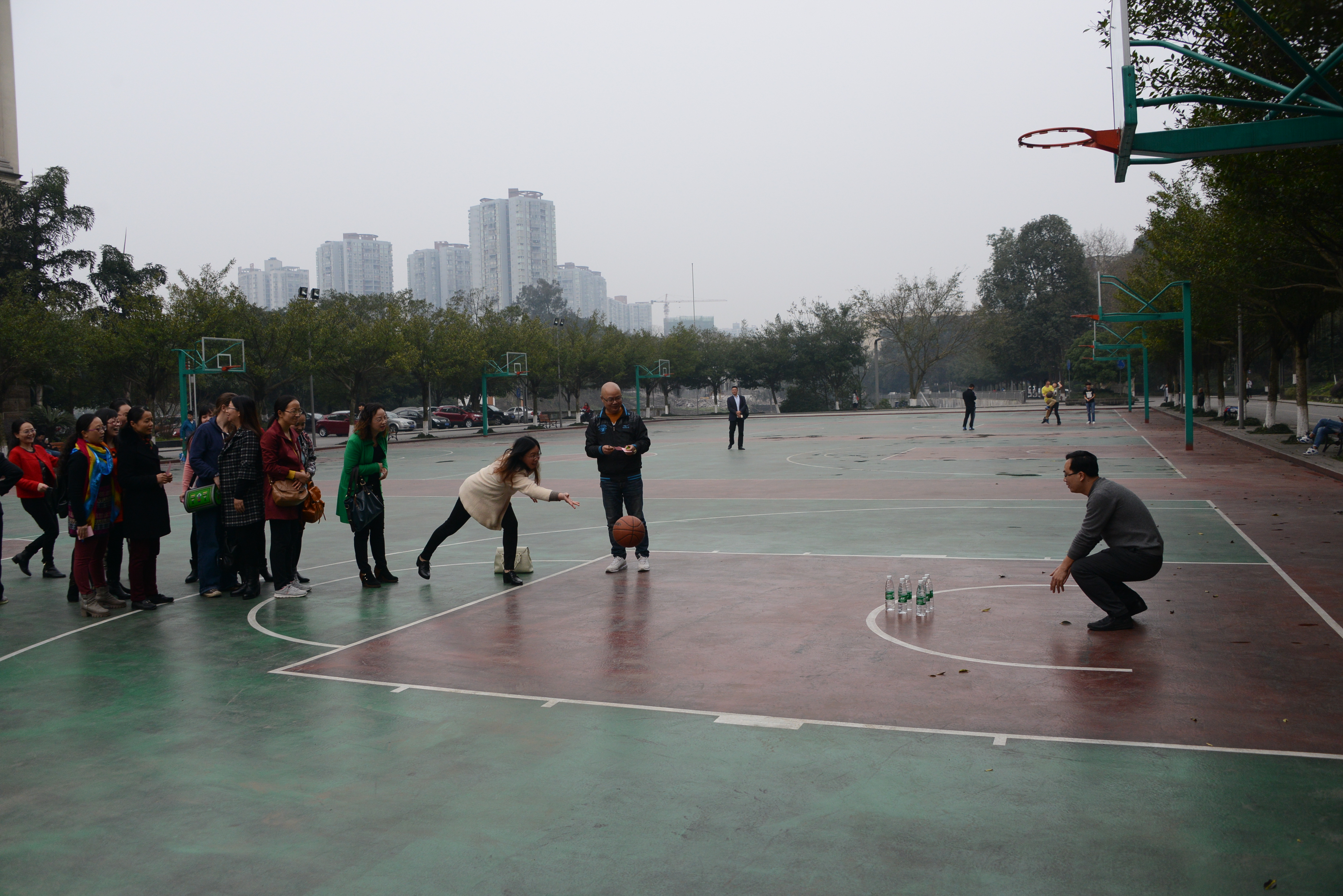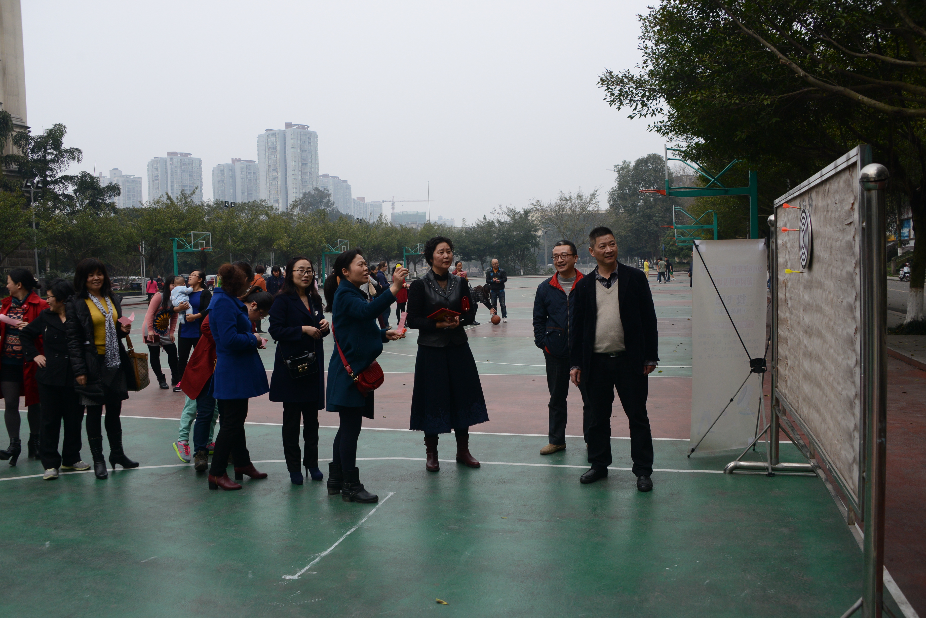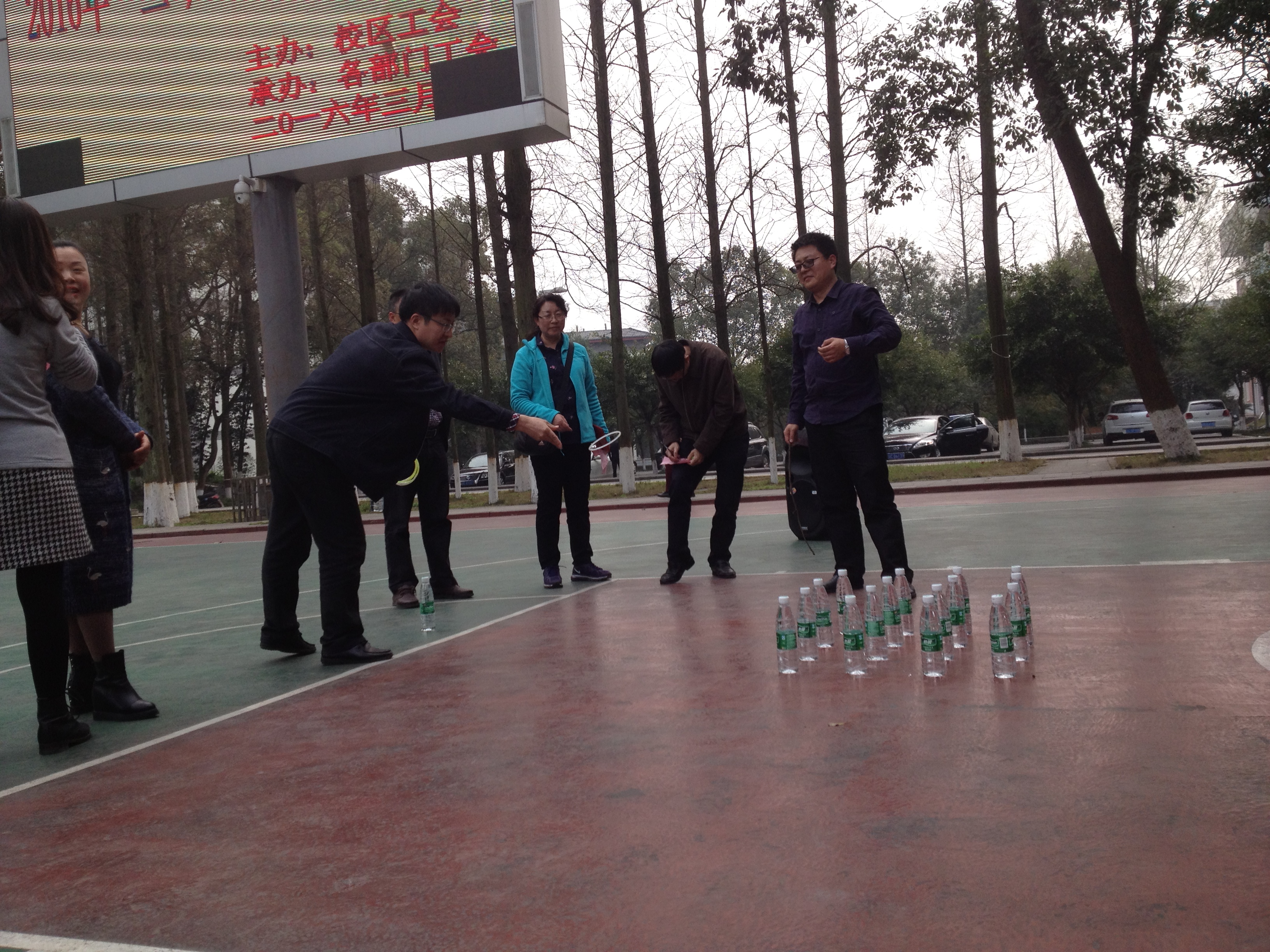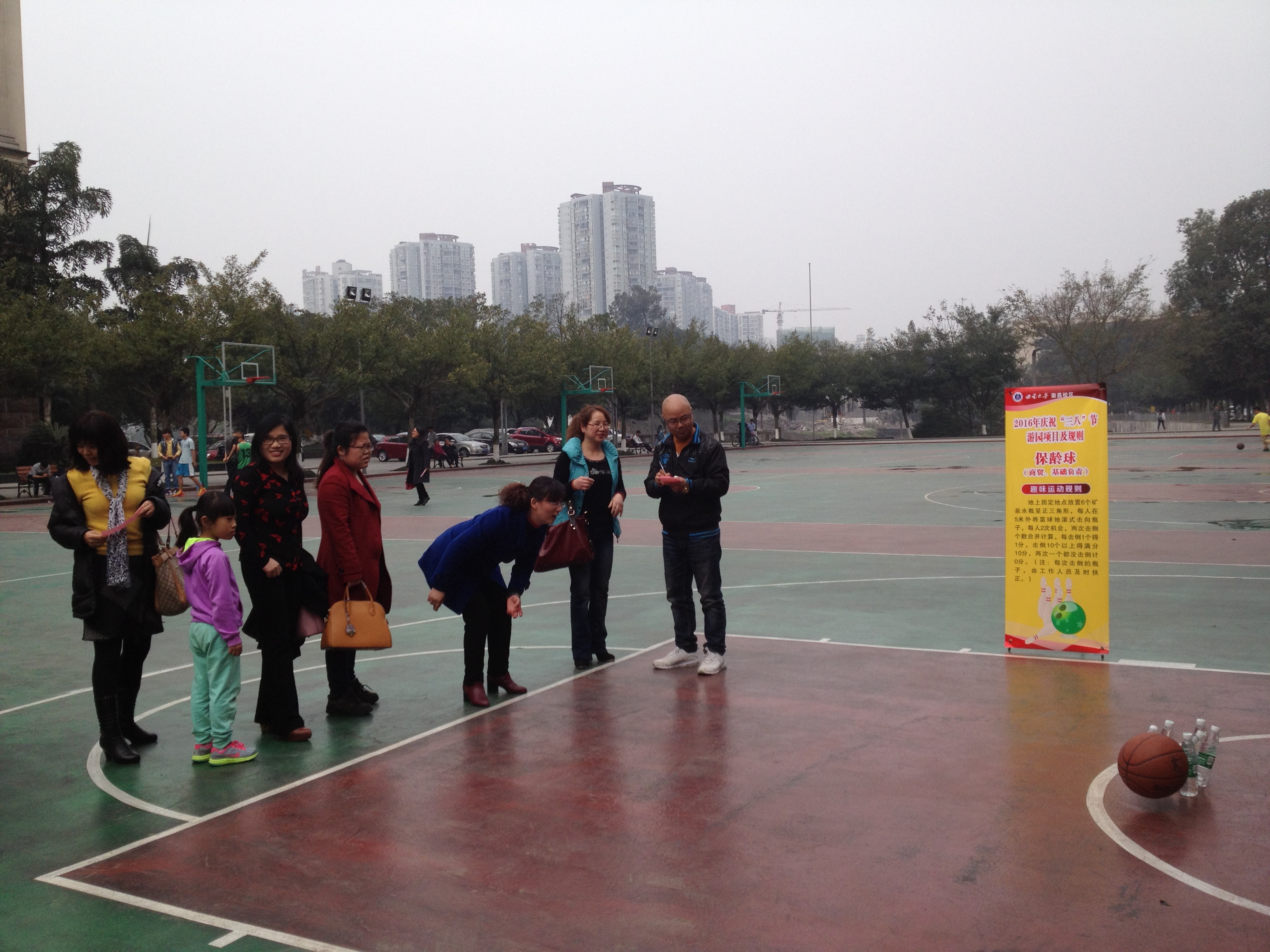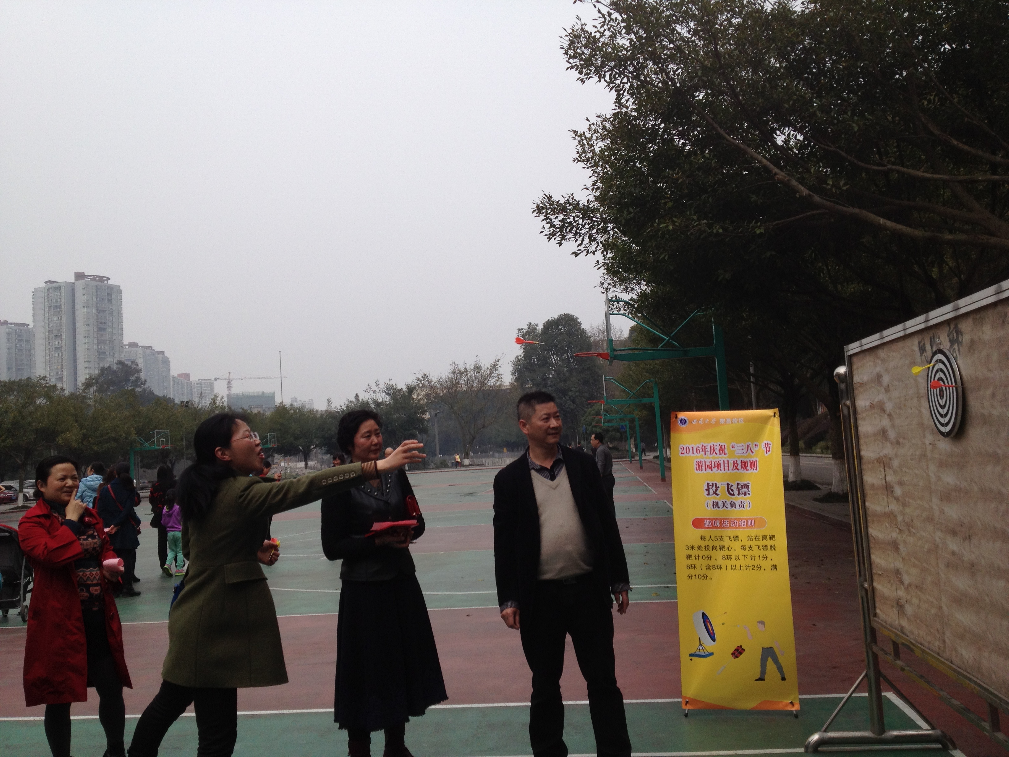随后,校区管委会主任左福元宣布活动开始。全体女职工和党政领导一起参加趣味活动,包括:投飞镖、吹蜡烛、套圈、插筷子、保龄球等项目。