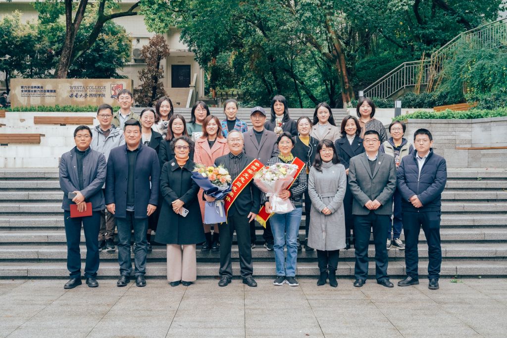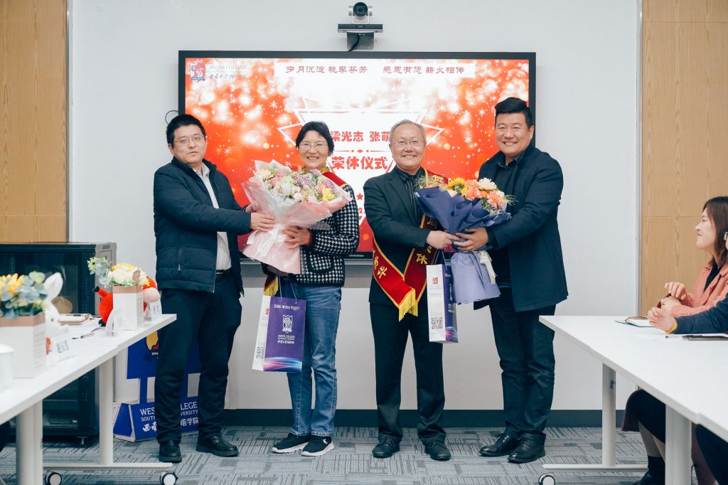 随后,王书记和赵院长分别为两位同志佩戴绶带,并赠送了学院精心准备的荣休礼物。西塔学院党委副书记滕超和副院长何兴还代表学院赠送了鲜花。