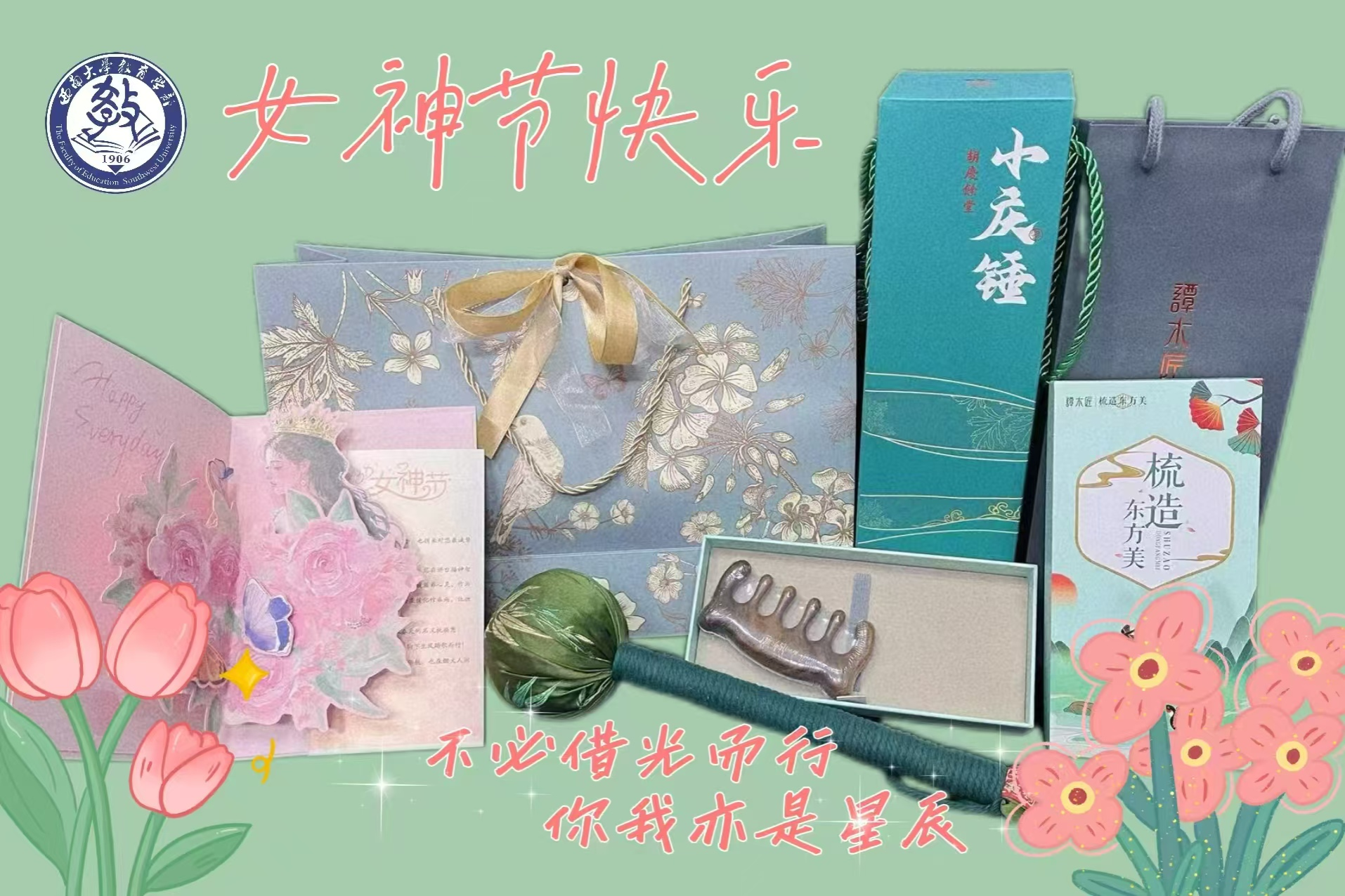 教育学部工会为全体女教师献上专属节日礼遇——承载匠心的谭木匠按摩梳轻抚鬓角,精巧的小庆锤敲散疲惫,祝福卡上的文字更如春风化雨:“愿您眼中有光采撷星辰,脚下生风踏歌而行;在知识的原野领航,亦于烟火人间拥抱春光!”这份兼具实用与美感的礼物,既是对教育者身心的关怀,亦是对育人初心的礼赞。接过礼盒的老师们笑靥如花,感慨道:“这就是我们引以为傲的‘幸福型学部’!”