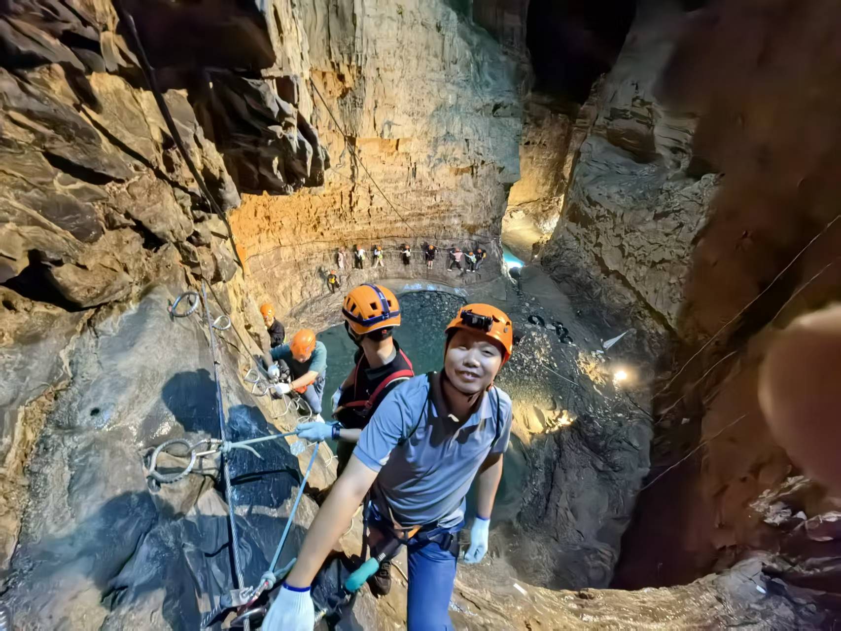 活动首日,先探访了清溪峡景区,那里的碧水丹霞、原始森林与奇峰异石构成了一幅天然画卷,老师们船游其间,感受山水相映的生态之美。随后转道十二背后溶洞群,勇士们在夜间挑战了洞穴探险项目——地心“飞拉达”。在专业指导下攀越峭壁、穿越洞穴,以勇气与协作突破体能极限,体验了别样的户外探险乐趣。第二日,大家游览了以“亚洲第一长洞”著称的双河洞,它的地质奇观令众人震撼。通过实地观察洞内暗河、竖井、穹顶、裂谷、钟乳石、石笋等景观,结合专业讲解,老师们直观了解了溶洞形成原理与地下喀斯特地貌的演化过程,将课堂知识延伸至自然现场,深化了对地质学、生态学交叉领域的认知。
