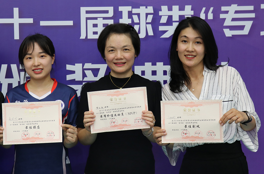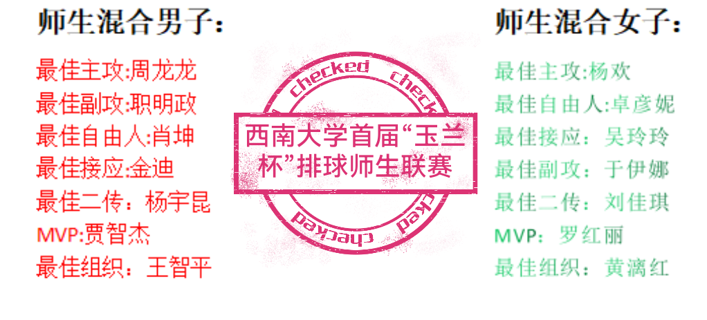 师生混合赛中共产生14颗明星,细看来路,蓦然发现8颗女星中就有5颗荣属西大女教排,其中有1颗竟在男队中耀熠,西大女教排顿时生发出“星星之家”的感觉。